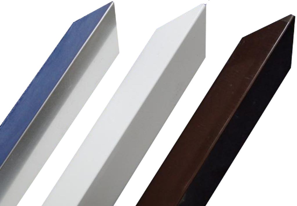 Ochranné lišty na rohy z hliníkového plechu sila 0,8mm v troch farebných variantoch -biela RAL 9003, hnedá RAL 8017 a prírodný hliník z nerezového plechu 0,8mm Výška 1 m.1,25ma1,5m, strany 4,5 cm Hore skosený