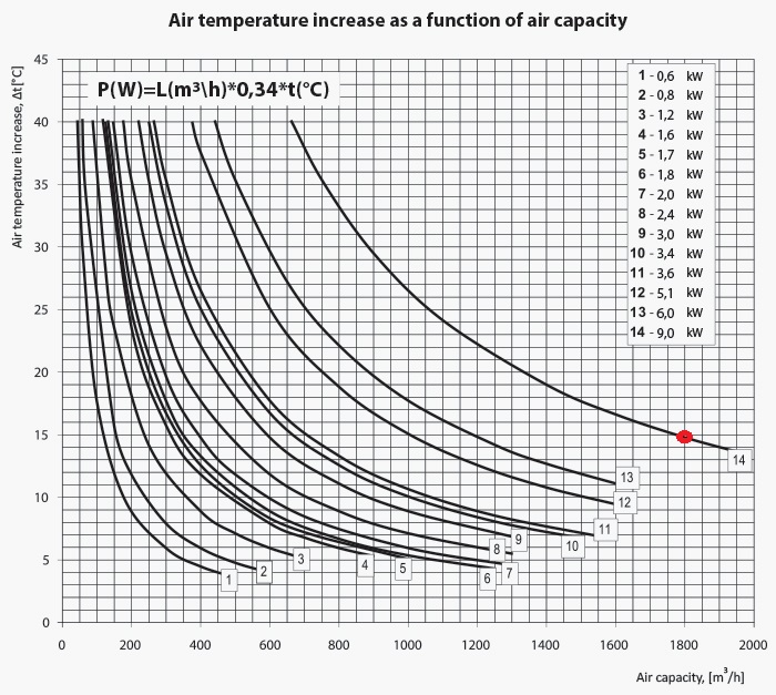 Príklad grafu:9 KW ohrievač pri výkone 1800m3/h zvyšuje teplotu o 15° С.Takto si na grafe vieme pozrieť aký ohrev vieme urobiť pri určitých výkonoch