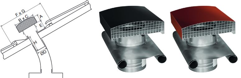 Strešný prechod kovový odolná voči poveternostným vplyvom vyrobená z ocele. Oblasť použitia Strešná priechodka pre prívod a odvod vzduchu vo ventilačných systémoch