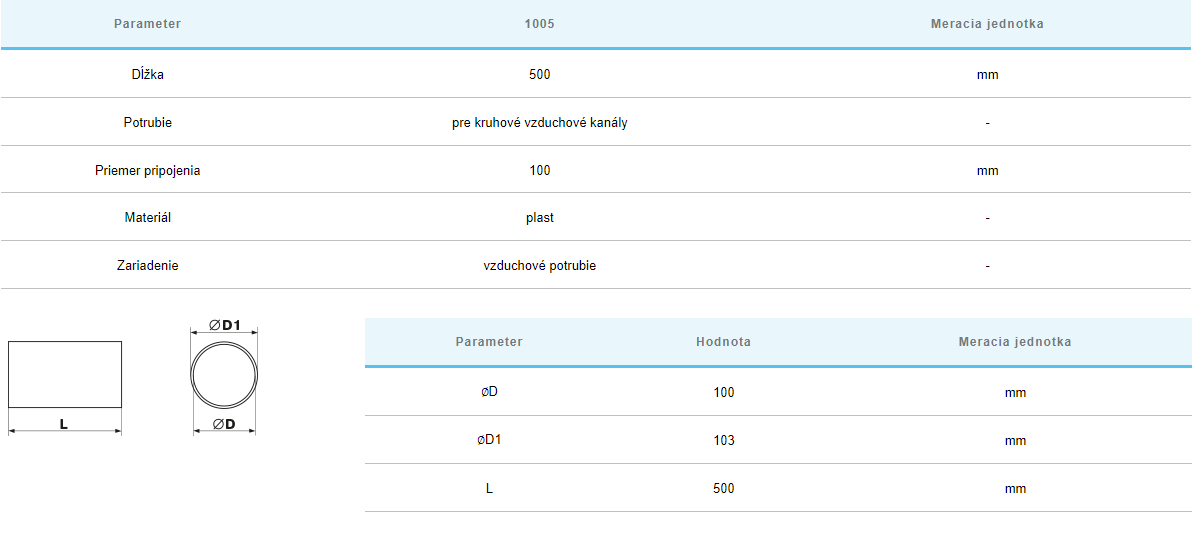 1005 Plastové potrubie okrúhle Ø 100mm dĺžka 0,5m na vzduchotechniku