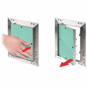 Revízne dvierka do sádrokartónu.Hlavná nosná konštrukcia a rám sú vyrobené z hliníkového profilu osadené nepremokavým sádrokartonom