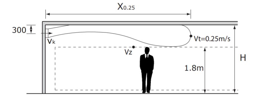 • Hodnoty sú uvedené pre izotermický privádzaný vzduch. Diaľkové vzdialenosti pre chladiace podmienky pri -11 K sa dajú vypočítať vydelením hodnôt X0,25 faktorom 1,1. Na vykurovacie účely pri Dt + 11 K by sa na danú hodnotu X 0,25 mal použiť multiplikátor 1,1.