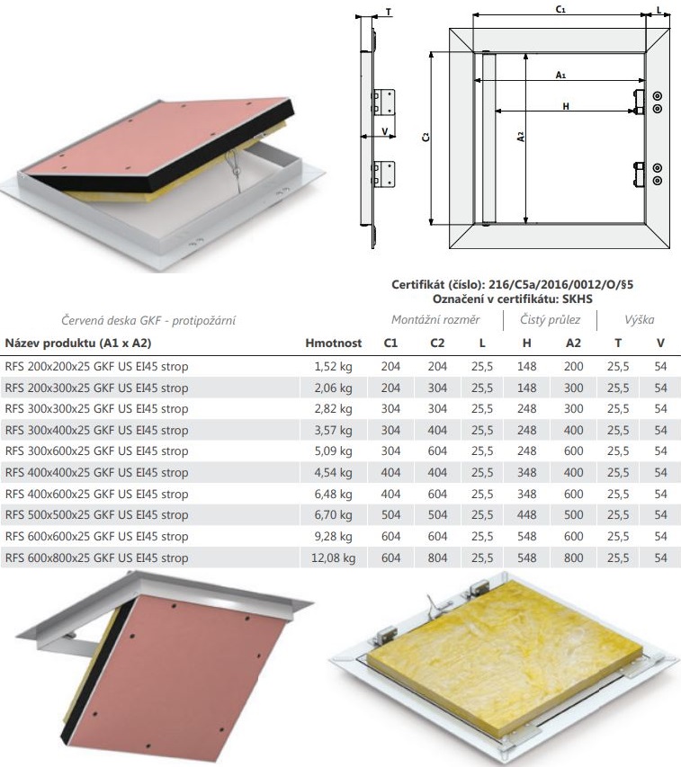 Aby dvierka spĺňala uvedenú požiarnu odolnosť, musí byť po zabudovaní do sadrokartónového stropu vždy osadená minerálnou vlnou v hrúbke 25 mm, ktorá musí zároveň spĺňať objemovú hmotnosť 150 kg / m 3 . Minerálnu vlnu je možné na zabudovaná dvierka voľne položiť z vnútornej strany, nemusí byť ukotvená.