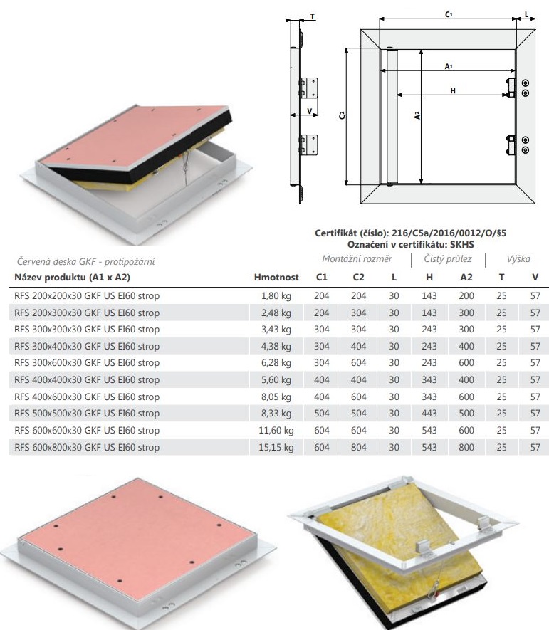 Dvierka sú vyrábané z hliníkových profi lov, ktoré sú zvárané do vonkajšieho a vnútorného rámu. Kompletná zostava je spojená pomocou pevného pántu a umožňuje tak otváranie krídla dvierok v prípade potreby. Vnútorná krídlo je osadené protipožiarnym tesnením, ktoré sa pri vysokej teplote mnohonásobne zväčší a zabráni tak prieniku ohňa. Výplň dvierok je tvorená červenou doskou, upevnenú pomocou samovrtných skrutiek.