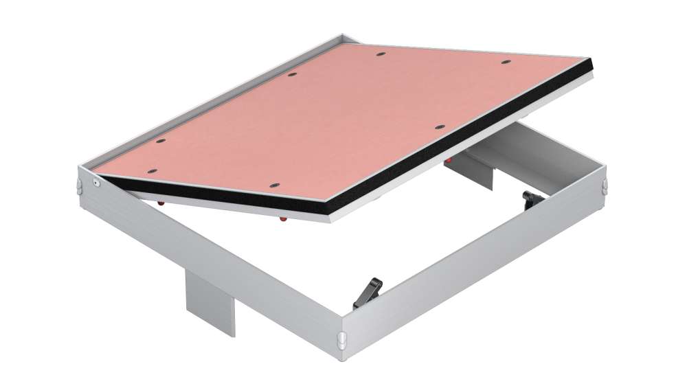 Dvierka sú vyrábané z hliníkových profi lov, ktoré sú zvárané do vonkajšieho a vnútorného rámu. Kompletná zostava je spojená pomocou pevného pántu a umožňuje tak otváranie krídla dvierok v prípade potreby. Na vonkajšom ráme sú navyše privarené montážne úchyty. Vnútorná krídlo je osadené protipožiarnym tesnením, ktoré sa pri vysokej teplote mnohonásobne zväčší a zabráni tak prieniku ohňa. Výplň dvierok je tvorená červenou doskou, upevnenú pomocou samovrtných skrutiek.