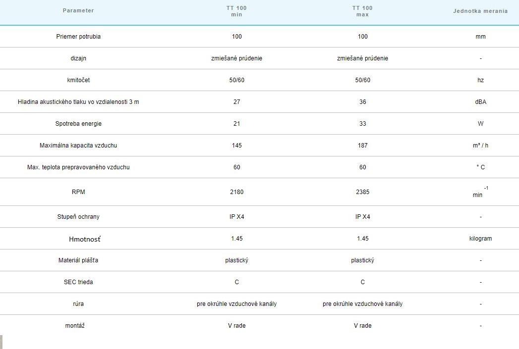 Axiálne odsávacie ventilátory VENTS TT 100T:vybavené regulovaným časovačom s oneskorením vypnutia nastaviteľným od 2 do 30 min sa používajú pre systémy ventilácie, ktoré vyžadujú vysoký tlak, silné prúdenie vzduchu a nízku hlučnosť .Ventilátory série TT sú najlepším riešením pre výmenu vzduchu v priestoroch s vysokou vlhkosťou, ako sú kúpeľne alebo kuchyne, rovnako ako pre vetranie bytov, chát, obchodov, kaviarní, kín a pod .