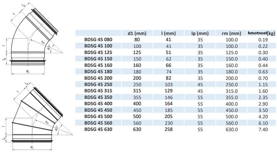 Vzduchotechnické profilové pozinkované 45° koleno-Ø125mm s gumovým
