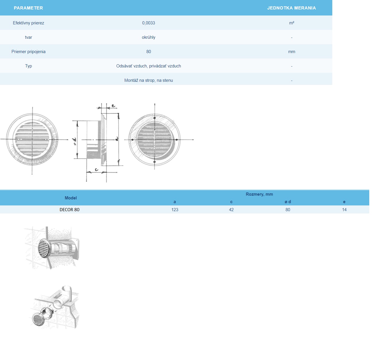 Plastová vetracia mriežka Blauberg Decor Vnútorný rozmer :80mm,krycia plocha:123mmje vysokokvalitná mriežka so sieťkou ,je vybavená zabudovateľným rámčekom.Rámček plastovej vetracia mriežka sa môže prilepiť alebo zamurovať.Po zatvrdnutí sa predná časť mriežky priklikne spät na rámček.Predná časť mriežky sa môže použiť aj bez rámčeka lepením na fasádu.Plastová vetracia mriežka Blauberg Decor je vhodná na zabudovanie do polystyrénu.