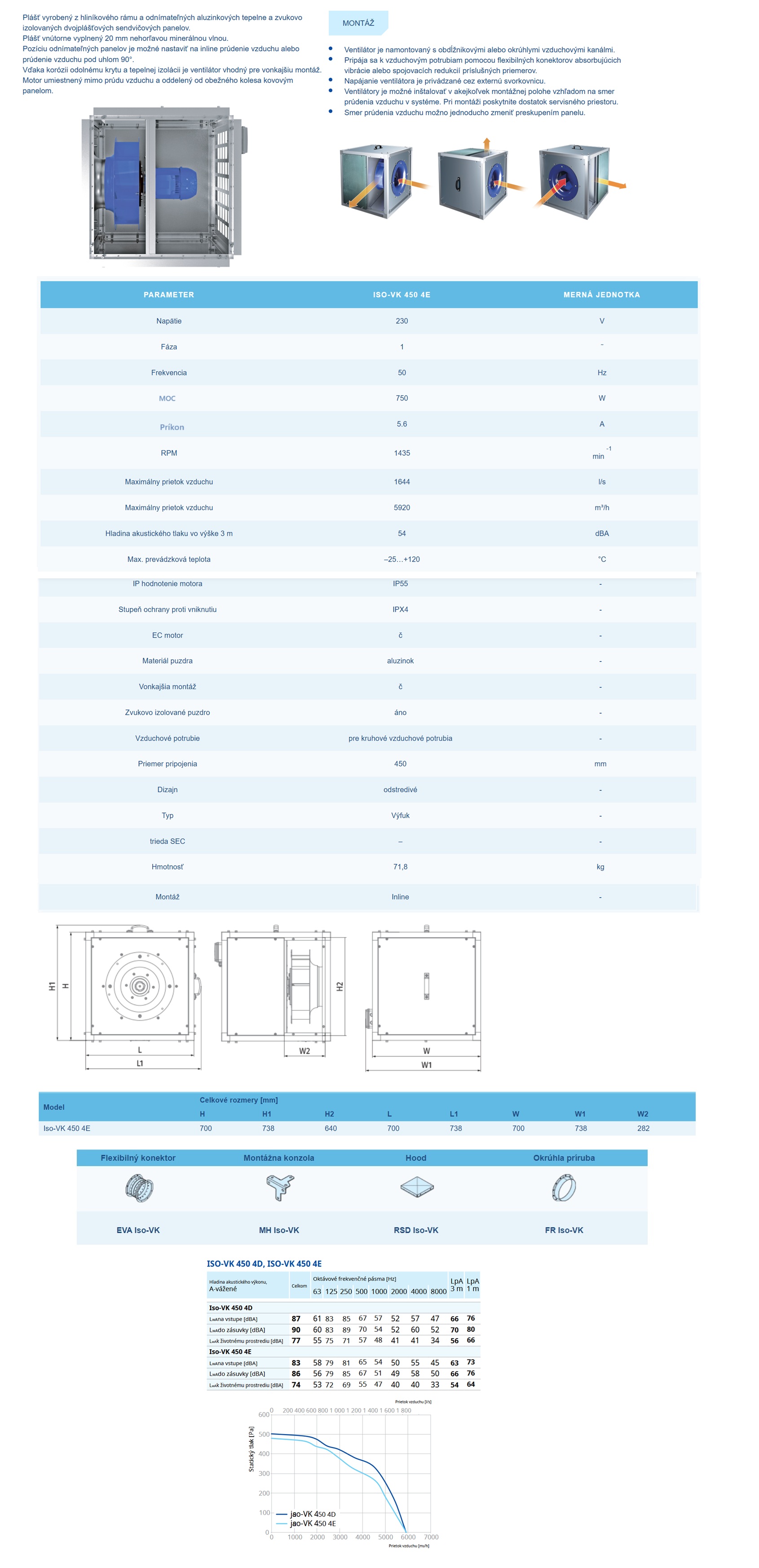 Priemyselný kuchynský odhlučnený radový radiálny ventilátor s AC motorom 230V -4-pólový.Prietok vzduchu až 5920m³/h na digestory sú určené na odsávanie znečisteného horúceho vzduchu do 120 °C, obsahujúceho mastnotu (pri použití tukových filtrov), v podmienkach vysokej odolnosti.