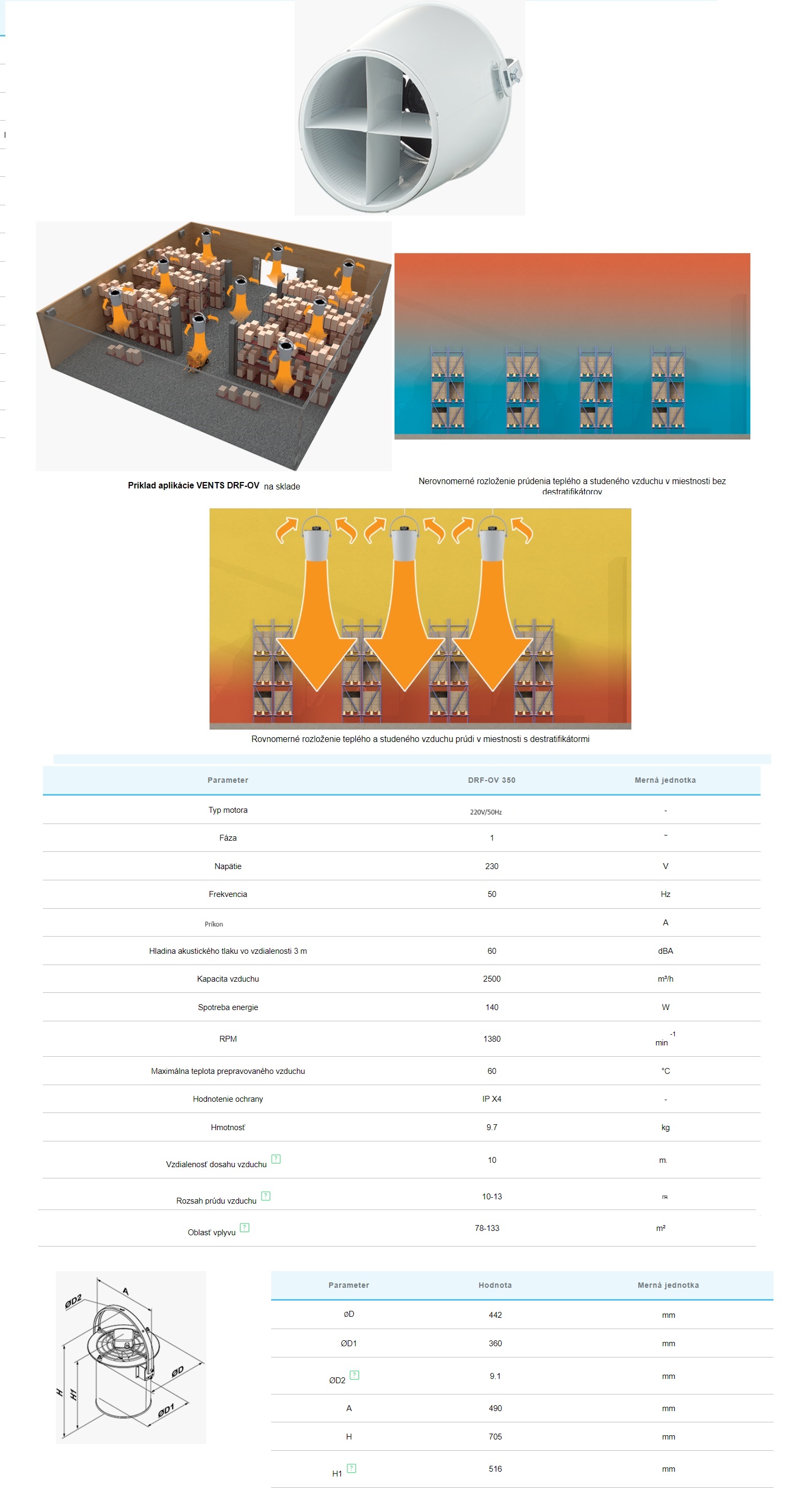 Destratifikátory Výkon 2500m3/h sa odporúčajú na použitie vo veľkých priestoroch s výškou nad 5 m, kde sa teplejší vzduch v dôsledku prirodzeného prúdenia vzduchu akumuluje bližšie k stropu, pričom teplota vzduchu v obývanom priestore (2 m nad úrovňou podlahy) zostáva nižšia. Destratifikátor pozostáva z axiálneho ventilátora, ktorý je pripevnený ku skrini pomocou antivibračných úchytov. Plášť destratifikátora DRF -OV je vyrobený z ocele potiahnutej polymérom. POPIS Teplý vzduch sa akumuluje vyššie vo vykurovaných výškových priestoroch. Teplota vzduchu stúpa o 1 °C na každý meter smerom nahor, čo vedie k tepelným stratám cez strechu. Destratifikátory smerujú teplý vzduch nahromadený pod stropom do obsadeného priestoru. Teplotný rozdiel medzi podlahou a stropom je minimalizovaný. Destratifikátory sú určené na zníženie tepelných strát a nákladov na vykurovanie.Destratifikátor sa montuje pomocou oblúkovej fixačnej konzoly so sklonom fixácie polohy po 15° a závitovým uchytením a bezpečnostnými lankami, každé s dĺžkou 3 m.Destratifikátor je vybavený jednofázovým asynchrónnym motorom s vonkajším rotorom a axiálnym obežným kolesom. Motory majú zabudovanú ochranu proti prehriatiu s automatickým reštartom. Motory sú vybavené guľôčkovým ložiskom. Krytie IP 44. Kroková alebo plynulá regulácia otáčok s tyristorovým alebo autotransformátorovým regulátorom otáčok. Jeden regulátor otáčok je schopný ovládať niekoľko destratifikátorov za podmienky, že celkový výkon a prevádzkový prúd neprekročí menovité parametre regulátora. VÝBER Výber destratifikátora je založený na predpoklade, že prevádzková vzdialenosť destratifikátora koreluje s výškou premisy ako 1:1,25. Počet destratifikátorov inštalovaných v areáli sa volí za predpokladu, že celková vzduchová kapacita je 1 až 2 objemy objektu. MONTÁŽ Destratifikátor je určený pre vnútornú inštaláciu v priestoroch chránených pred poveternostnými vplyvmi. Destratifikátory sú určené pre montáž pod strop so smerovacou tryskou smerom dole. Destratifikátor musí byť buď napevno pripevnený k nosnej konštrukcii alebo zavesený pomocou montážnej súpravy dodávanej s dodávkou. Destratifikátor je pripojený k elektrickej sieti cez externú svorkovnicu. Elektrické pripojenia a inštalácie musia byť v súlade s návodom k produktu a schémou zapojenia na svorkovnici.