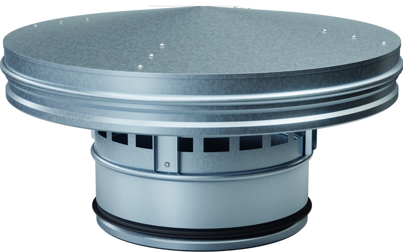 Vzduchotechnický strešný kryt z pozinkovanej ocele s ochrannou mriežkou Ø 355mm, vertikálnym nasávaním alebo výfukom s gumovým tesnením.