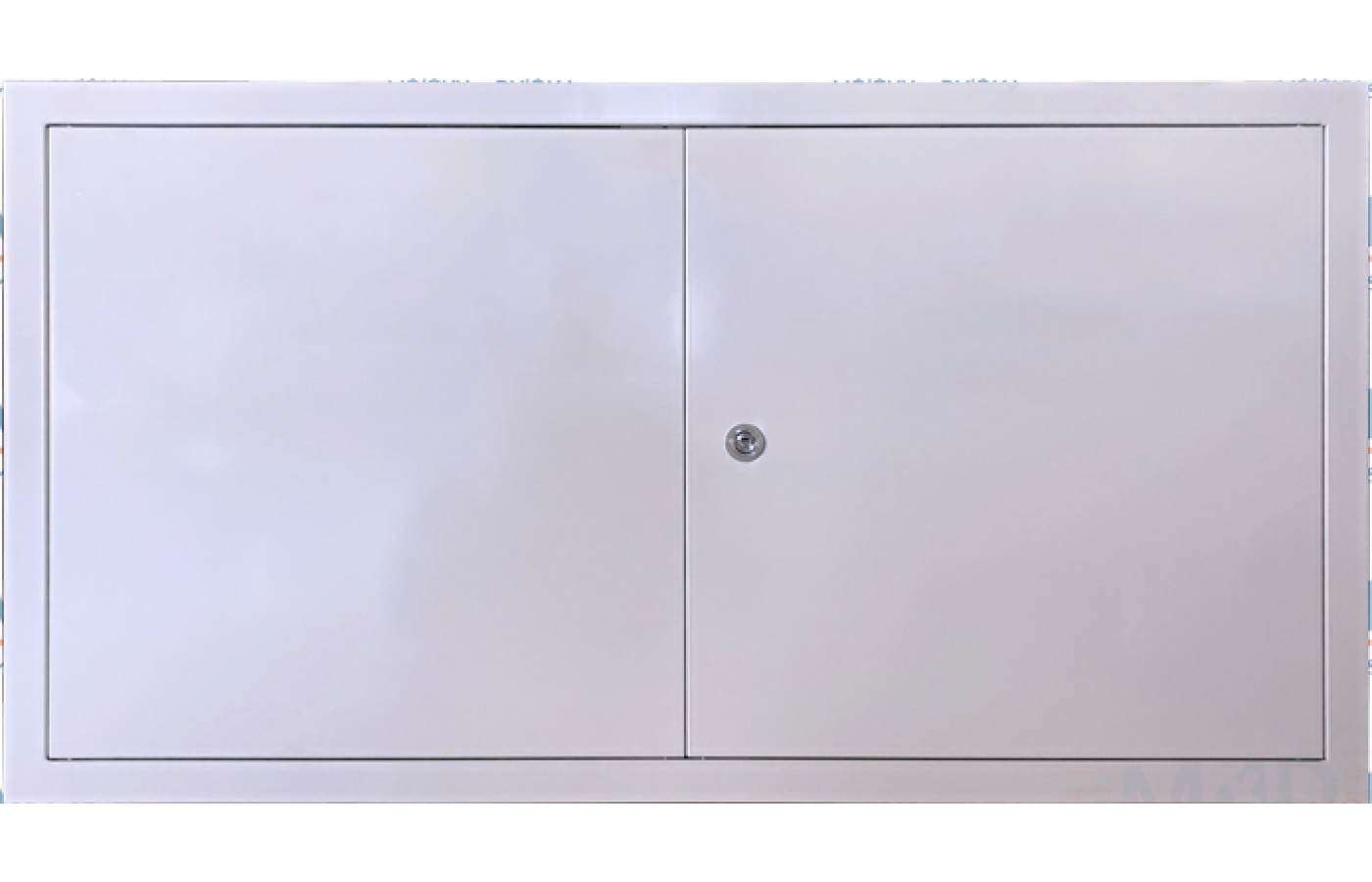 Dvojkrídlové revízne dvierka šírka 1000x výška400mm udáva svetlosť montážneho otvoru. bez stredového stĺpika.Revízne dvierka i rám sú vyrobené z pozinkovaného plechu o sile 1,0 mm bieleho lakovaného práškovou farbou RAL 9010.
