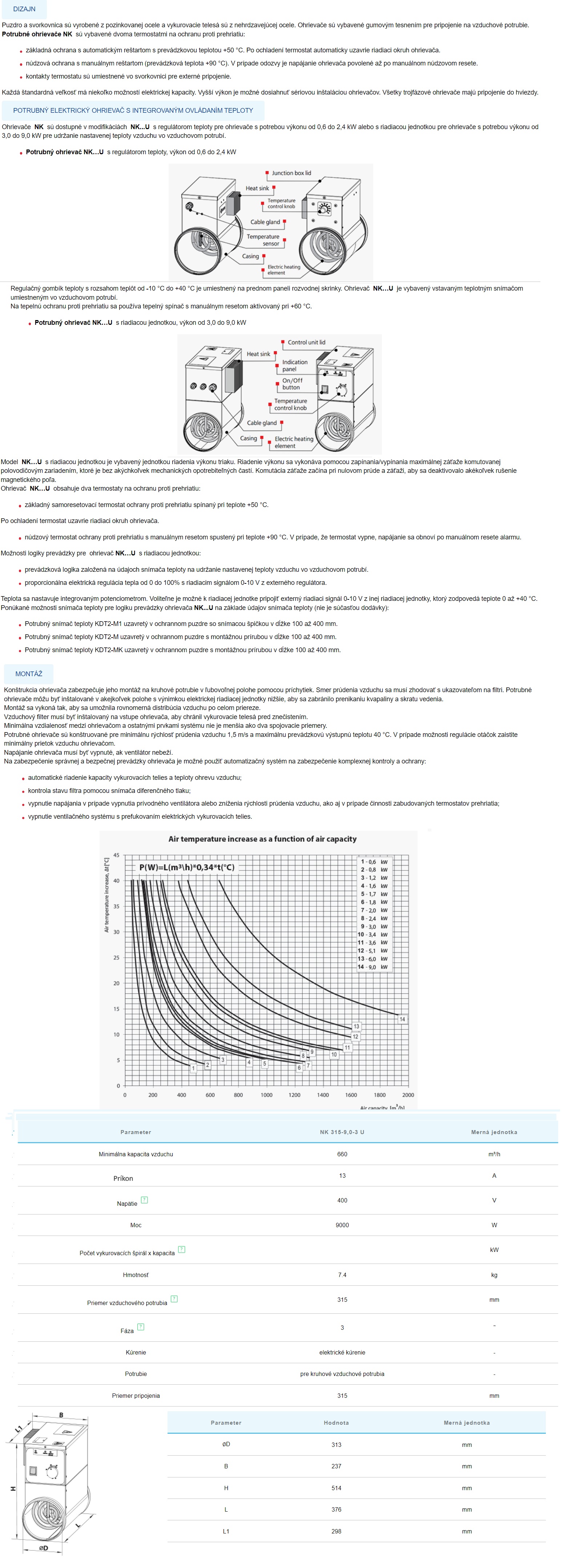 Potrubné elektrické ohrievače VENTS typ NK -315-9,0-3U-s triákom sú určené na ohrev privádzaného vzduchu v kruhovom potrubnom vetracom systéme. Ohrievače sa používajú vo vykurovacích, ventilačných a klimatizačných systémoch pre rôzne priestory. DIZAJN Puzdro a svorkovnica sú vyrobené z pozinkovanej ocele a vykurovacie telesá sú z nehrdzavejúcej ocele. Ohrievače sú vybavené gumovým tesnením pre pripojenie na vzduchové potrubie. Potrubné ohrievače NK sú vybavené dvoma termostatmi na ochranu proti prehriatiu: