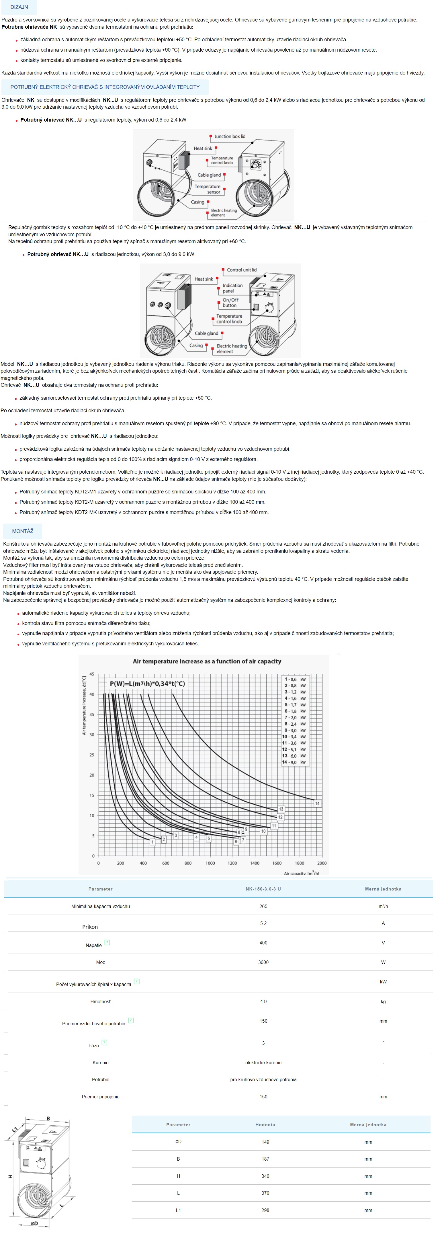 Potrubné elektrické ohrievače VENTS typ NK -150-3,6-3U-s triákom sú určené na ohrev privádzaného vzduchu v kruhovom potrubnom vetracom systéme. Ohrievače sa používajú vo vykurovacích, ventilačných a klimatizačných systémoch pre rôzne priestory. DIZAJN Puzdro a svorkovnica sú vyrobené z pozinkovanej ocele a vykurovacie telesá sú z nehrdzavejúcej ocele. Ohrievače sú vybavené gumovým tesnením pre pripojenie na vzduchové potrubie. Potrubné ohrievače NK sú vybavené dvoma termostatmi na ochranu proti prehriatiu: