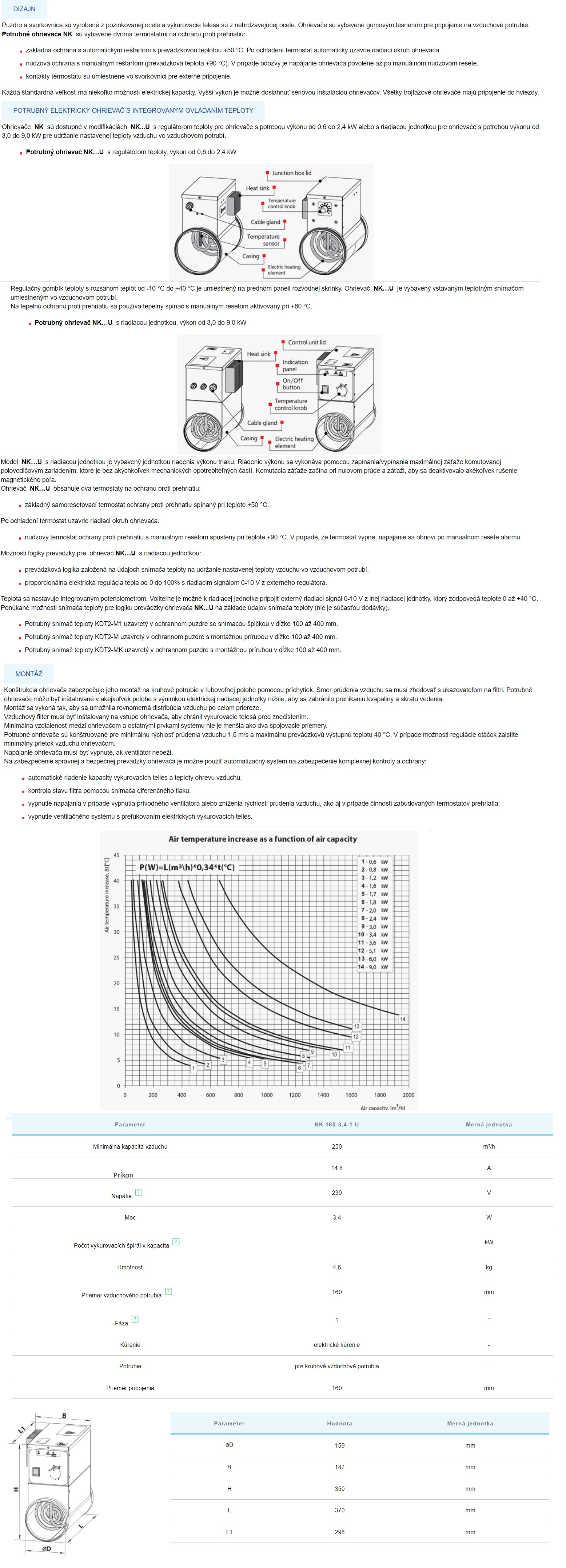 Potrubné elektrické ohrievače VENTS typ NK -160-3,4-1U-s triákom sú určené na ohrev privádzaného vzduchu v kruhovom potrubnom vetracom systéme. Ohrievače sa používajú vo vykurovacích, ventilačných a klimatizačných systémoch pre rôzne priestory. DIZAJN Puzdro a svorkovnica sú vyrobené z pozinkovanej ocele a vykurovacie telesá sú z nehrdzavejúcej ocele. Ohrievače sú vybavené gumovým tesnením pre pripojenie na vzduchové potrubie. Potrubné ohrievače NK sú vybavené dvoma termostatmi na ochranu proti prehriatiu: