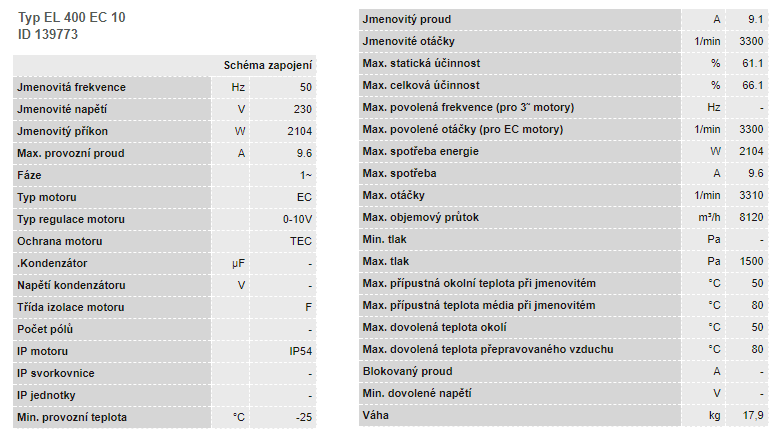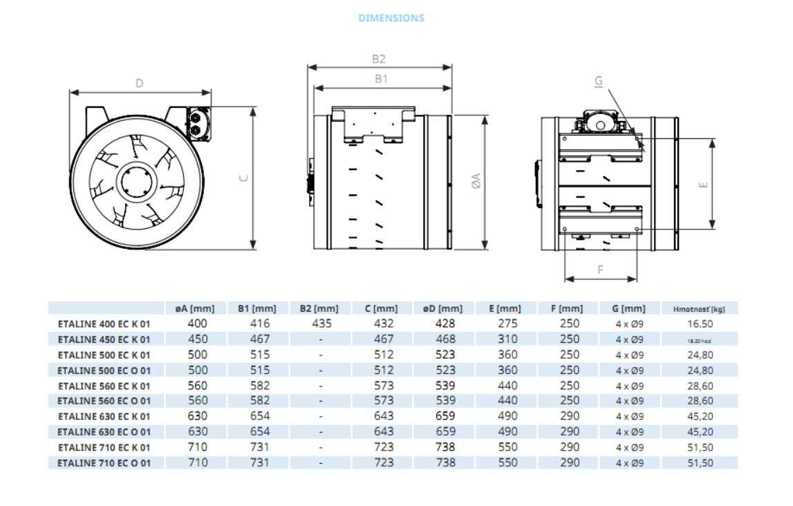 Poloradiálny potrubný ventilátor s EC motorom. Poloradiálny potrubný ventilátor ETALINE je vhodný na umiestnenie tam, kde je málo miesta, pretože priemer telesa prístroja nie je väčší alebo oveľa väčší ako priemer pripojovacieho potrubia. Puzdro je vyrobené z polyamidu. Séria ventilátorov pracuje s vysokou účinnosťou v celom výkonovom rozsahu. Vďaka vysokej účinnosti dosiahnutej aerodynamikou ventilátora, ako aj vstavaným motorom, je celý produktový rad kompaktný a hmotnostne optimalizovaný. Diagonálny ventilátor s trojrozmerne tvarovanými lopatkami obežného kolesa a trojrozmerne tvarovaným smerom prúdenia difúzora, čo má za následok najvyššiu možnú aerodynamickú účinnosť. Obežné koleso je staticky a dynamicky vyvážené podľa G6.3 DIN ISO. 1970. Motor bol zakrytý v oblasti náboja kolesa, takže nepôsobí rušivo na aerodynamiku. Zabudovaný tepelný spínač chráni motor v prípade preťaženia. Vysoká účinnosť ventilátora ETALINE je založená na jeho aerodynamickej kvalite. Vďaka axiálnemu prúdeniu táto séria výrazne minimalizuje straty odporu vzduchu v porovnaní s radiálnymi ventilátormi. Určené pre reguláciu napätia so zabudovanými asynchrónnymi motormi a transformátorovým stupňovým spínačom. Elektrické pripojenie sa vykonáva cez kábel vedený cez kryt alebo v spojovacej skrinke namontovanej na kryte. Vzhľadom k tomu, že motor je inštalovaný v hriadeli statora, mimo prúdenie vzduchu, ventilátory ETALINE slúžia na vetranie kancelárií, škôl, parkovísk, priemyselných aplikácií, ale je možné dopravovať aj mierne prašný vzduch. Nevhodné na odsávanie vlhkého vzduchu (max. 55 % relatívnej vlhkosti).