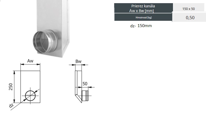 Rozvody vzduchu hranaté.Kanál prechod kolmý 150mm na kanál rúra 150×50.Materiál :pozinkovaný plech.Použitie Prívod vzduchu ku krbu z exteriéru:Rozvody teplého vzduchu od krbu v podlahe.Na každé spojenie prvkov sústavy je potrebná spojka15x5 cm . bodovo zvárané – prierez: mm 150×50 – materiál: vyrobené z pozinkovaného oceľového plechu – hrúbka 0,5mm