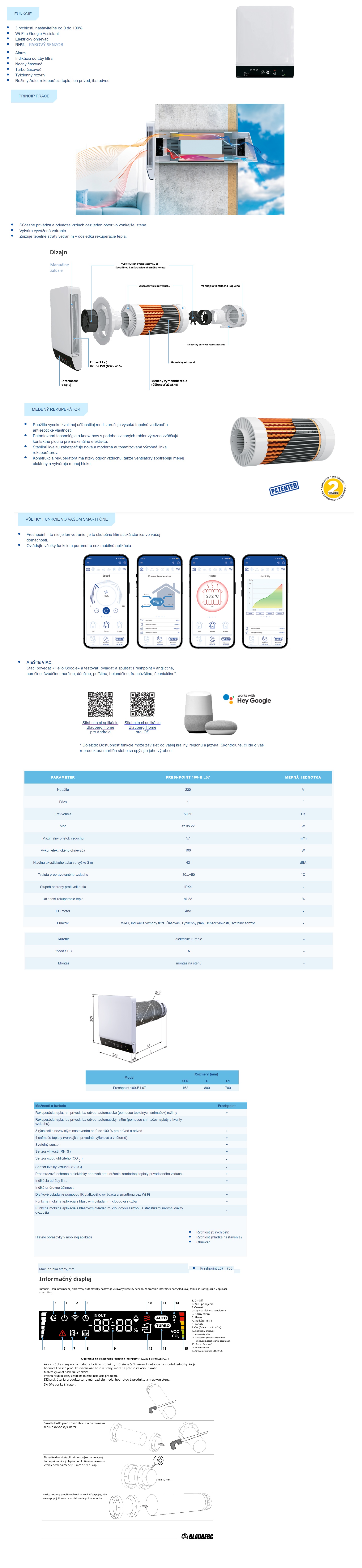 Lokálny rekuperátor Blauberg Freshpoint 160-E L07-dvojmotorový s ohrevom priemer162mm výkon 70m3/h v režime TURBO s predohrevom 100W dĺžka potrubia 70cm zrezateľné na požadovaný rozmer steny minimálna hrúbka steny je 50cm.Je najmodernejšie riešenie, ktoré kombinuje špičkovú filtráciu vzduchu, vetranie s rekuperáciou tepla, inteligentné riadenie energie a užívateľsky prívetivé rozhranie. Vďaka svojmu kompaktnému dizajnu a ekologickej výrobe poskytuje efektívny a udržateľný spôsob, ako zlepšiť kvalitu vzduchu v interiéri a zároveň znížiť spotrebu energie.Súčasne privádza a odvádza vzduch cez jeden otvor vo vonkajšej stene.