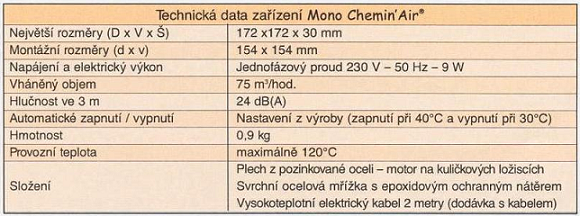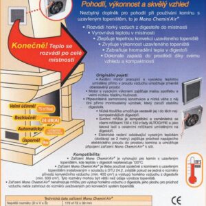 Krbový ventilátor MonoChemin Air slúži na odvedenie teplého vzduchu zo sopúcha krbu.Krbový ventilátor vytvára nútený obeh (cirkuláciu) teplého vzduchu do miestnosti. Napomáha saniu zohriatého vzduchu z teplovzdušných rozvodov, čím zvyšuje účinnosť teplovzdušného kúrenia
