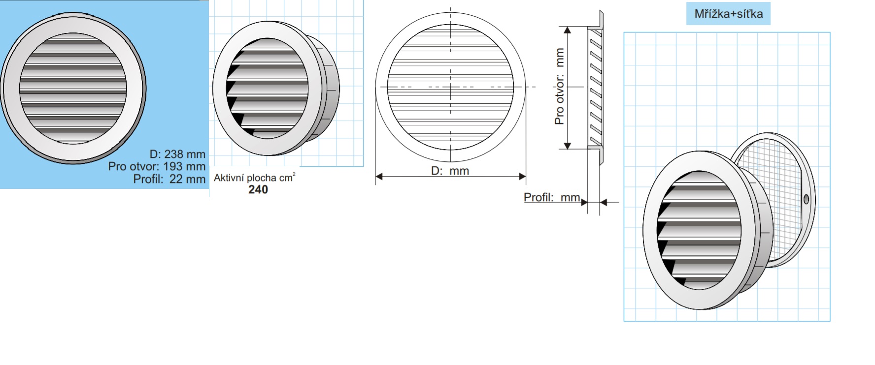 plocha:238mm.Farba:biela so sieťkou proti hmyzu.Materiál: ABS