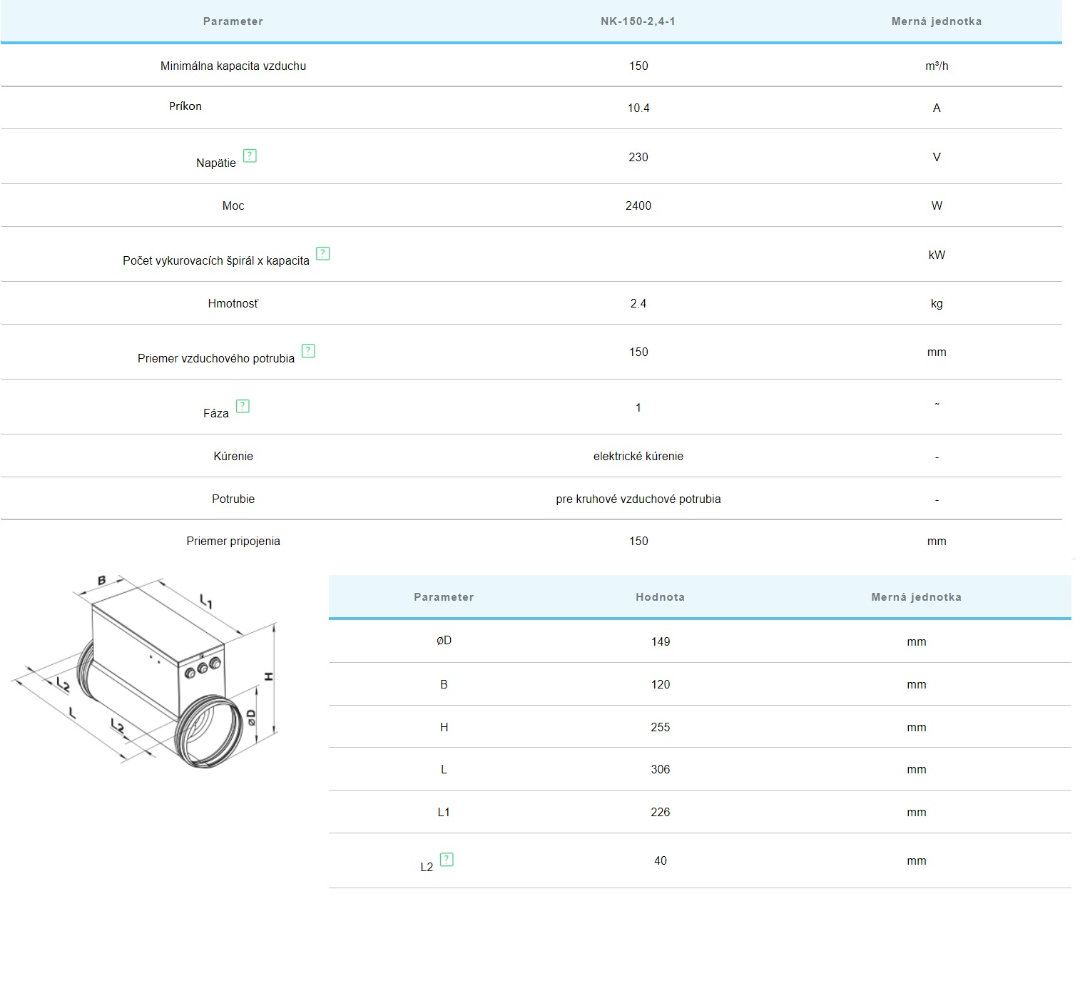 Potrubné elektrické ohrievače 150mm 2,4KW 1fázový 230V sú určené na ohrev privádzaného vzduchu v kruhovom potrubnom vetracom systéme. Ohrievače sa používajú vo vykurovacích, ventilačných a klimatizačných systémoch pre rôzne priestory. DIZAJN Puzdro a svorkovnica sú vyrobené z pozinkovanej ocele a vykurovacie telesá sú z nehrdzavejúcej ocele. Ohrievače sú vybavené gumovým tesnením pre pripojenie na vzduchové potrubie. Potrubné ohrievače NK sú vybavené dvoma termostatmi na ochranu proti prehriatiu: základná ochrana s automatickým reštartom s prevádzkovou teplotou +50 °С. Po ochladení termostat automaticky uzavrie riadiaci okruh ohrievača. núdzová ochrana s manuálnym reštartom (prevádzková teplota +90 °С). V prípade odozvy je napájanie ohrievača povolené až po manuálnom núdzovom resete. kontakty termostatu sú umiestnené vo svorkovnici pre externé pripojenie. Každá štandardná veľkosť má niekoľko možností elektrickej kapacity. Vyšší výkon je možné dosiahnuť sériovou inštaláciou ohrievačov. Všetky trojfázové ohrievače majú pripojenie do hviezdy. MONTÁŽ Konštrukcia ohrievača zabezpečuje jeho montáž na kruhové potrubie v ľubovoľnej polohe pomocou príchytiek. Smer prúdenia vzduchu sa musí zhodovať s ukazovateľom na filtri. Potrubné ohrievače môžu byť inštalované v akejkoľvek polohe s výnimkou elektrickej riadiacej jednotky nižšie, aby sa zabránilo prenikaniu kvapaliny a skratu vedenia. Montáž sa vykoná tak, aby sa umožnila rovnomerná distribúcia vzduchu po celom priereze. Vzduchový filter musí byť inštalovaný na vstupe ohrievača, aby chránil vykurovacie telesá pred znečistením. Minimálna vzdialenosť medzi ohrievačom a ostatnými prvkami systému nie je menšia ako dva spojovacie priemery. Potrubné ohrievače sú konštruované pre minimálnu rýchlosť prúdenia vzduchu 1,5 m/s a maximálnu prevádzkovú výstupnú teplotu 40 °С. V prípade možnosti regulácie otáčok zaistite minimálny prietok vzduchu ohrievačom. Ak ventilátor nebeží, je potrebné vypnúť napájanie ohrievača. Na zabezpečenie správnej a bezpečnej prevádzky ohrievača je možné použiť automatizačný systém na zabezpečenie komplexnej kontroly a ochrany: automatické riadenie kapacity vykurovacích telies a teploty ohrevu vzduchu; kontrola stavu filtra pomocou snímača diferenčného tlaku; vypnutie napájania v prípade vypnutia prívodného ventilátora alebo zníženia rýchlosti prúdenia vzduchu, ako aj v prípade činnosti zabudovaných termostatov prehriatia; vypnutie ventilačného systému s prefukovaním elektrických vykurovacích telies.