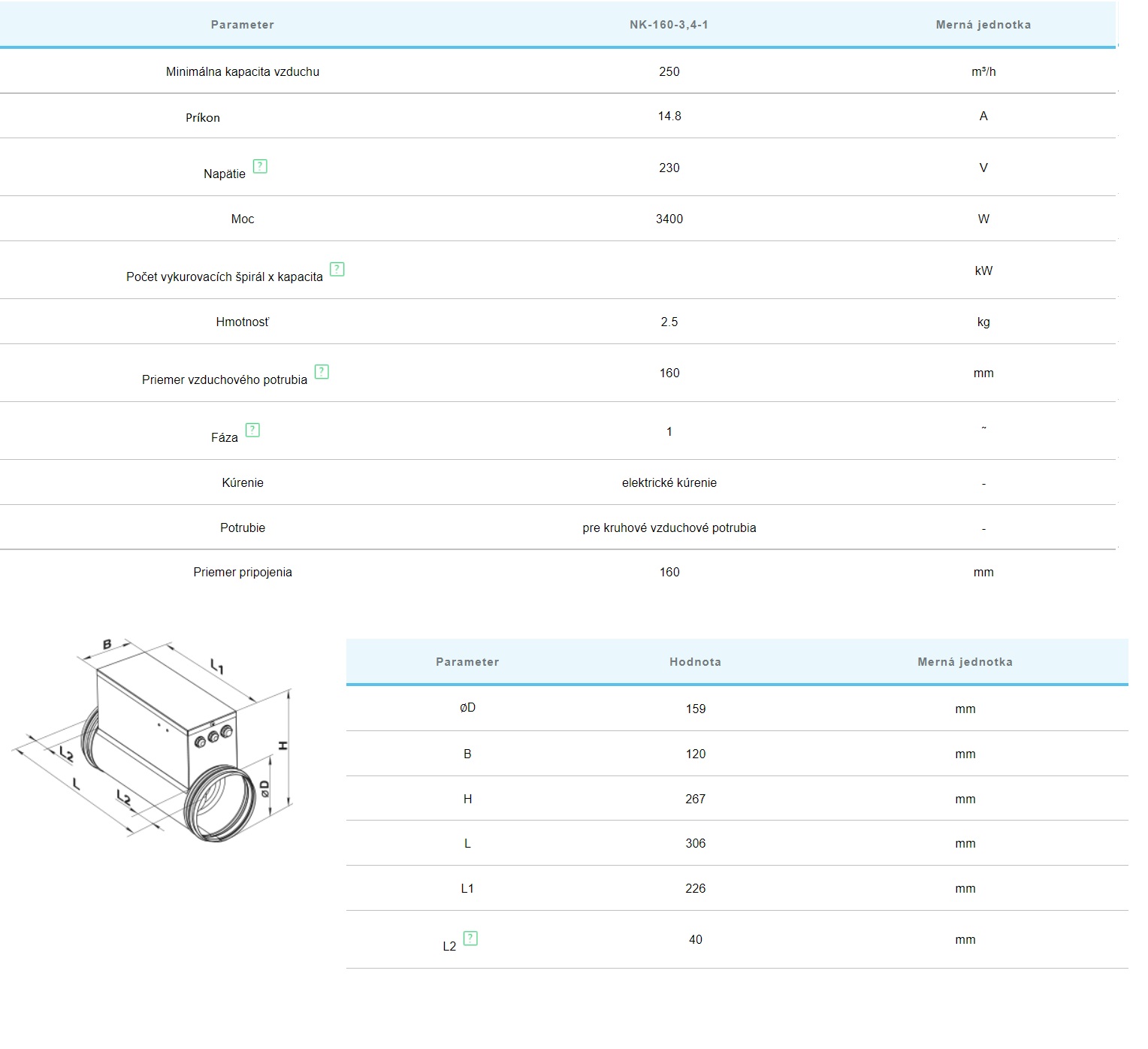 Potrubné elektrické ohrievače 160mm 3,4KW 1fázový 230V sú určené na ohrev privádzaného vzduchu v kruhovom potrubnom vetracom systéme. Ohrievače sa používajú vo vykurovacích, ventilačných a klimatizačných systémoch pre rôzne priestory. DIZAJN Puzdro a svorkovnica sú vyrobené z pozinkovanej ocele a vykurovacie telesá sú z nehrdzavejúcej ocele. Ohrievače sú vybavené gumovým tesnením pre pripojenie na vzduchové potrubie. Potrubné ohrievače NK sú vybavené dvoma termostatmi na ochranu proti prehriatiu: základná ochrana s automatickým reštartom s prevádzkovou teplotou +50 °С. Po ochladení termostat automaticky uzavrie riadiaci okruh ohrievača. núdzová ochrana s manuálnym reštartom (prevádzková teplota +90 °С). V prípade odozvy je napájanie ohrievača povolené až po manuálnom núdzovom resete. kontakty termostatu sú umiestnené vo svorkovnici pre externé pripojenie. Každá štandardná veľkosť má niekoľko možností elektrickej kapacity. Vyšší výkon je možné dosiahnuť sériovou inštaláciou ohrievačov. Všetky trojfázové ohrievače majú pripojenie do hviezdy. MONTÁŽ Konštrukcia ohrievača zabezpečuje jeho montáž na kruhové potrubie v ľubovoľnej polohe pomocou príchytiek. Smer prúdenia vzduchu sa musí zhodovať s ukazovateľom na filtri. Potrubné ohrievače môžu byť inštalované v akejkoľvek polohe s výnimkou elektrickej riadiacej jednotky nižšie, aby sa zabránilo prenikaniu kvapaliny a skratu vedenia. Montáž sa vykoná tak, aby sa umožnila rovnomerná distribúcia vzduchu po celom priereze. Vzduchový filter musí byť inštalovaný na vstupe ohrievača, aby chránil vykurovacie telesá pred znečistením. Minimálna vzdialenosť medzi ohrievačom a ostatnými prvkami systému nie je menšia ako dva spojovacie priemery. Potrubné ohrievače sú konštruované pre minimálnu rýchlosť prúdenia vzduchu 1,5 m/s a maximálnu prevádzkovú výstupnú teplotu 40 °С. V prípade možnosti regulácie otáčok zaistite minimálny prietok vzduchu ohrievačom. Ak ventilátor nebeží, je potrebné vypnúť napájanie ohrievača. Na zabezpečenie správnej a bezpečnej prevádzky ohrievača je možné použiť automatizačný systém na zabezpečenie komplexnej kontroly a ochrany: automatické riadenie kapacity vykurovacích telies a teploty ohrevu vzduchu; kontrola stavu filtra pomocou snímača diferenčného tlaku; vypnutie napájania v prípade vypnutia prívodného ventilátora alebo zníženia rýchlosti prúdenia vzduchu, ako aj v prípade činnosti zabudovaných termostatov prehriatia; vypnutie ventilačného systému s prefukovaním elektrických vykurovacích telies.