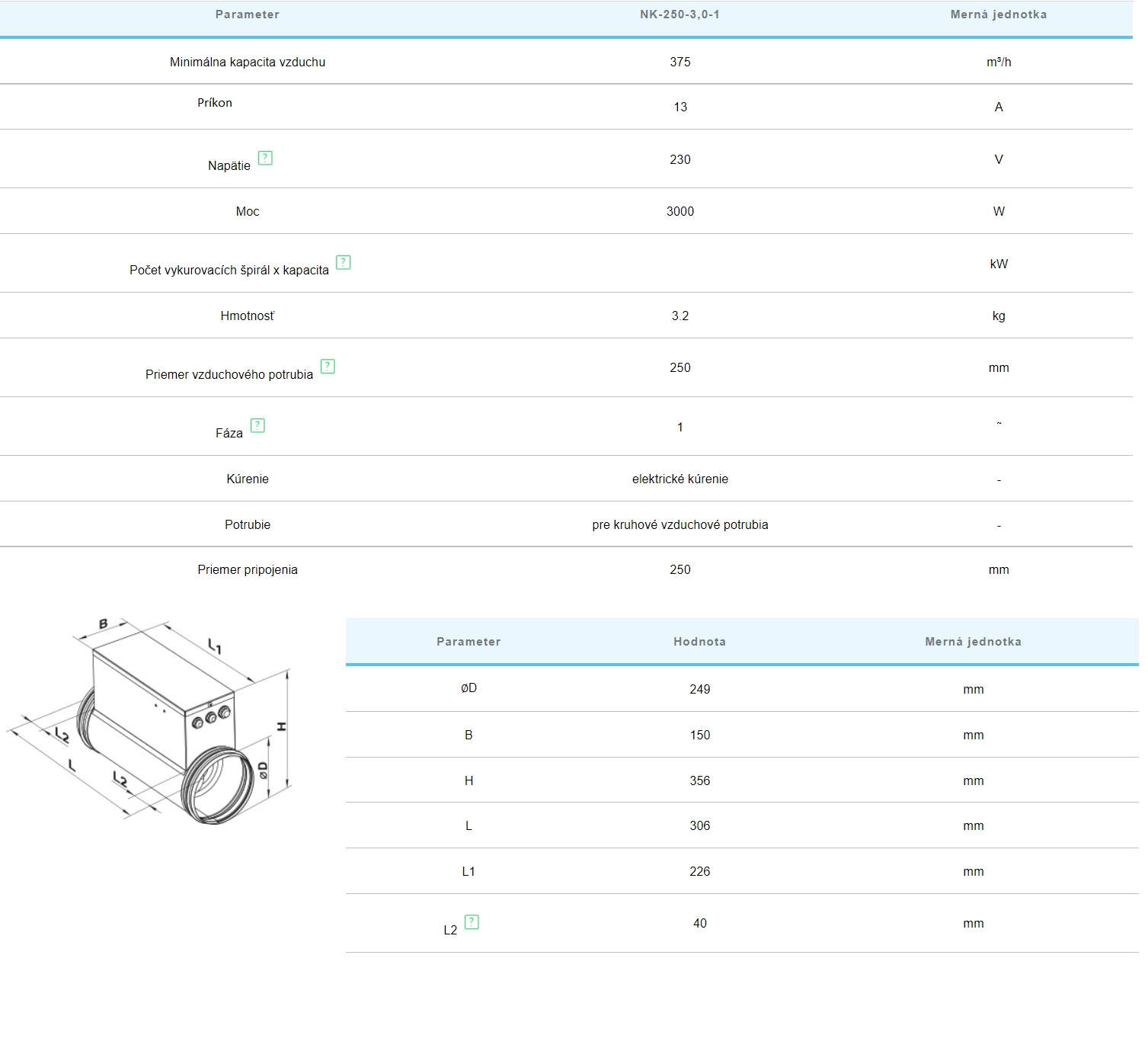 Potrubné elektrické ohrievače 250mm 3,0KW 1fázový 230V sú určené na ohrev privádzaného vzduchu v kruhovom potrubnom vetracom systéme. Ohrievače sa používajú vo vykurovacích, ventilačných a klimatizačných systémoch pre rôzne priestory. DIZAJN Puzdro a svorkovnica sú vyrobené z pozinkovanej ocele a vykurovacie telesá sú z nehrdzavejúcej ocele. Ohrievače sú vybavené gumovým tesnením pre pripojenie na vzduchové potrubie. Potrubné ohrievače NK sú vybavené dvoma termostatmi na ochranu proti prehriatiu: základná ochrana s automatickým reštartom s prevádzkovou teplotou +50 °С. Po ochladení termostat automaticky uzavrie riadiaci okruh ohrievača. núdzová ochrana s manuálnym reštartom (prevádzková teplota +90 °С). V prípade odozvy je napájanie ohrievača povolené až po manuálnom núdzovom resete. kontakty termostatu sú umiestnené vo svorkovnici pre externé pripojenie. Každá štandardná veľkosť má niekoľko možností elektrickej kapacity. Vyšší výkon je možné dosiahnuť sériovou inštaláciou ohrievačov. Všetky trojfázové ohrievače majú pripojenie do hviezdy. MONTÁŽ Konštrukcia ohrievača zabezpečuje jeho montáž na kruhové potrubie v ľubovoľnej polohe pomocou príchytiek. Smer prúdenia vzduchu sa musí zhodovať s ukazovateľom na filtri. Potrubné ohrievače môžu byť inštalované v akejkoľvek polohe s výnimkou elektrickej riadiacej jednotky nižšie, aby sa zabránilo prenikaniu kvapaliny a skratu vedenia. Montáž sa vykoná tak, aby sa umožnila rovnomerná distribúcia vzduchu po celom priereze. Vzduchový filter musí byť inštalovaný na vstupe ohrievača, aby chránil vykurovacie telesá pred znečistením. Minimálna vzdialenosť medzi ohrievačom a ostatnými prvkami systému nie je menšia ako dva spojovacie priemery. Potrubné ohrievače sú konštruované pre minimálnu rýchlosť prúdenia vzduchu 1,5 m/s a maximálnu prevádzkovú výstupnú teplotu 40 °С. V prípade možnosti regulácie otáčok zaistite minimálny prietok vzduchu ohrievačom. Ak ventilátor nebeží, je potrebné vypnúť napájanie ohrievača. Na zabezpečenie správnej a bezpečnej prevádzky ohrievača je možné použiť automatizačný systém na zabezpečenie komplexnej kontroly a ochrany: automatické riadenie kapacity vykurovacích telies a teploty ohrevu vzduchu; kontrola stavu filtra pomocou snímača diferenčného tlaku; vypnutie napájania v prípade vypnutia prívodného ventilátora alebo zníženia rýchlosti prúdenia vzduchu, ako aj v prípade činnosti zabudovaných termostatov prehriatia; vypnutie ventilačného systému s prefukovaním elektrických vykurovacích telies.