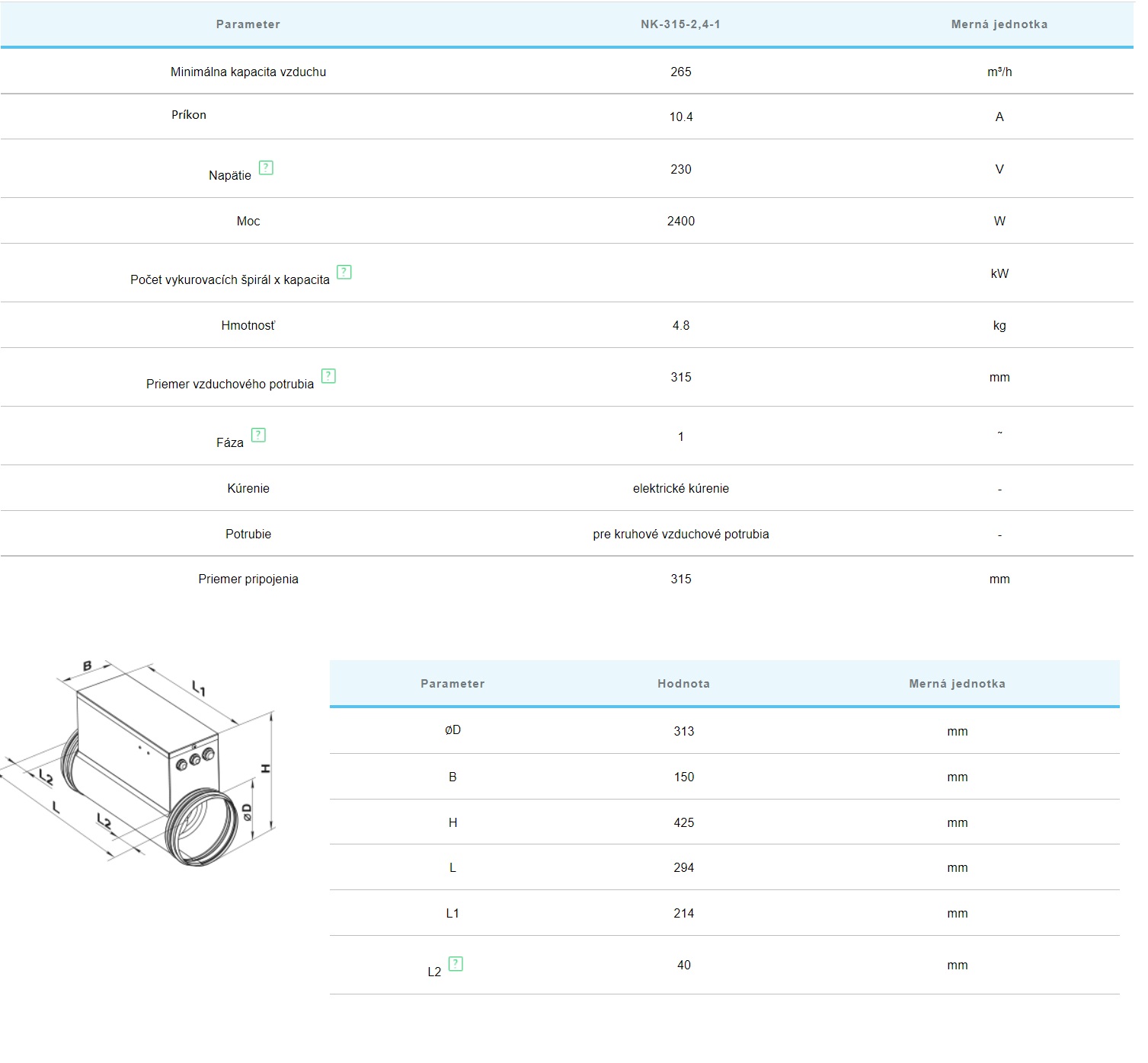Potrubné elektrické ohrievače 315mm 2,4KW 1fázový 230V sú určené na