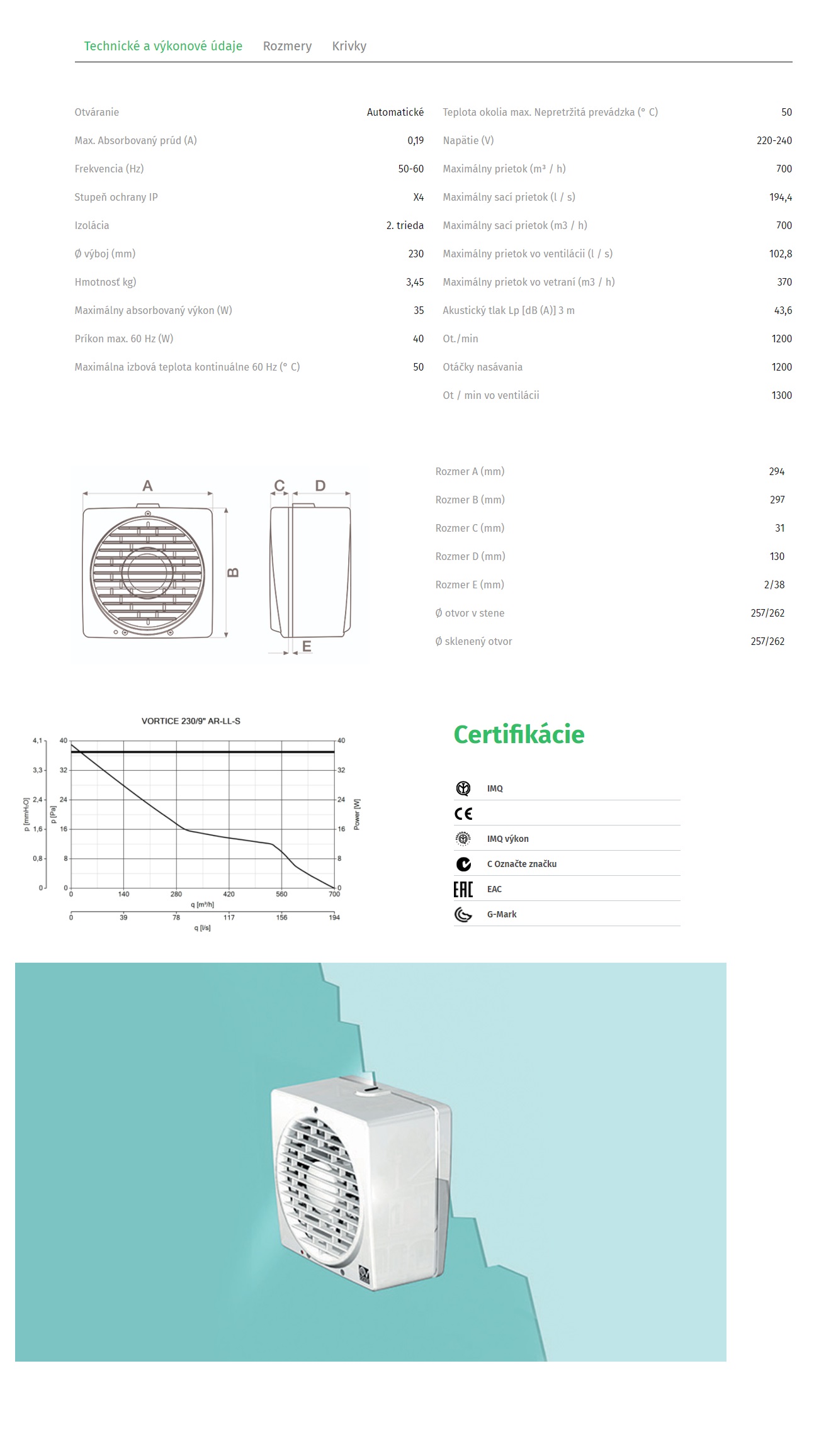 Okenný ventilátor VORTICE VARIO V 230/9″ AR LL S – Výkon 700/370 m3/h – Hlučnosť 43,6 Lp dB(A)Model pre inštaláciu na okno / stenu.