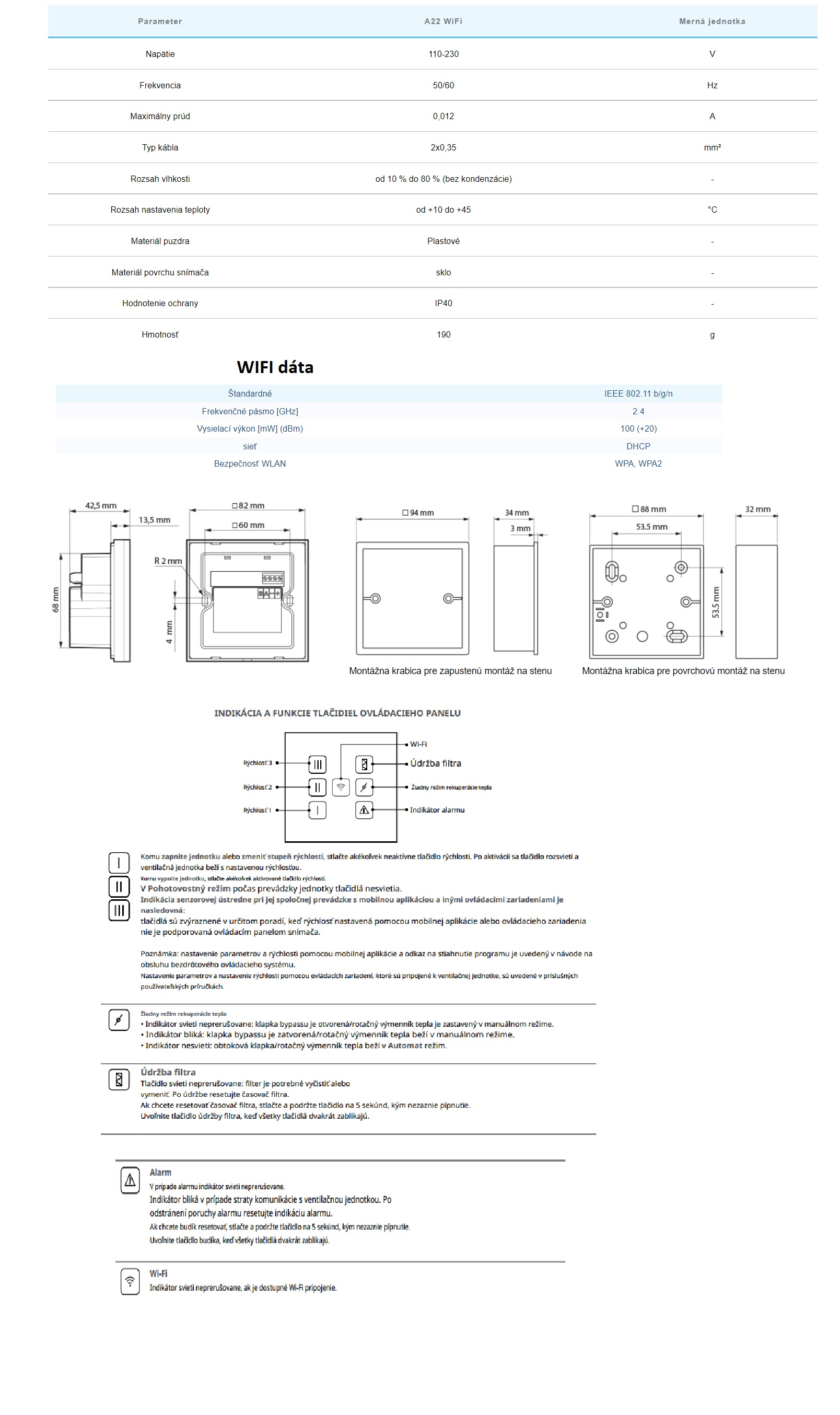 Ovládací panel A22 WiFi slúži na ovládanie rekuperačných jednotiek s automatizačným systémom A21, pripojených k jednotke cez Wi-Fi.