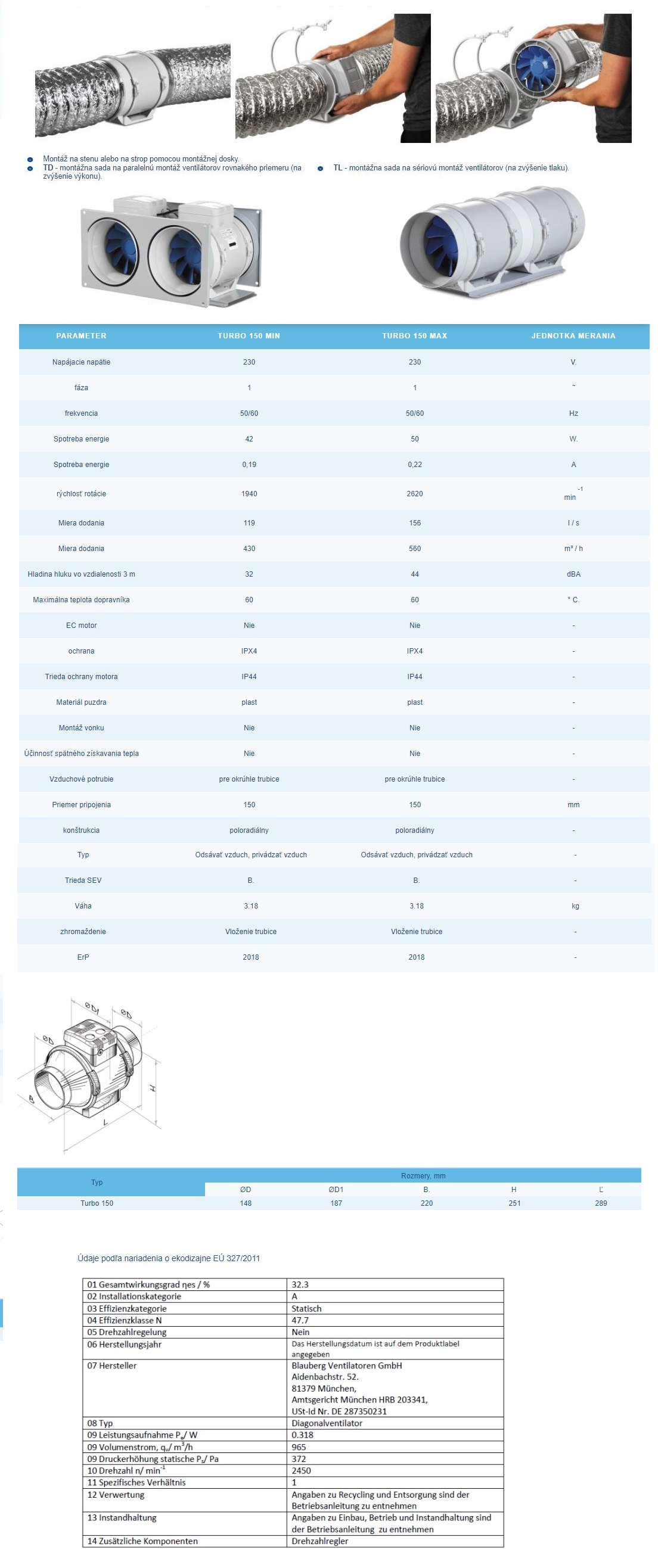 Poloradiálne potrubné ventilátory Blauberg Turbo 150 priemer 150mm-dvojrýchlostný výkon:430-560m3/h napätie 230V sú určené pre