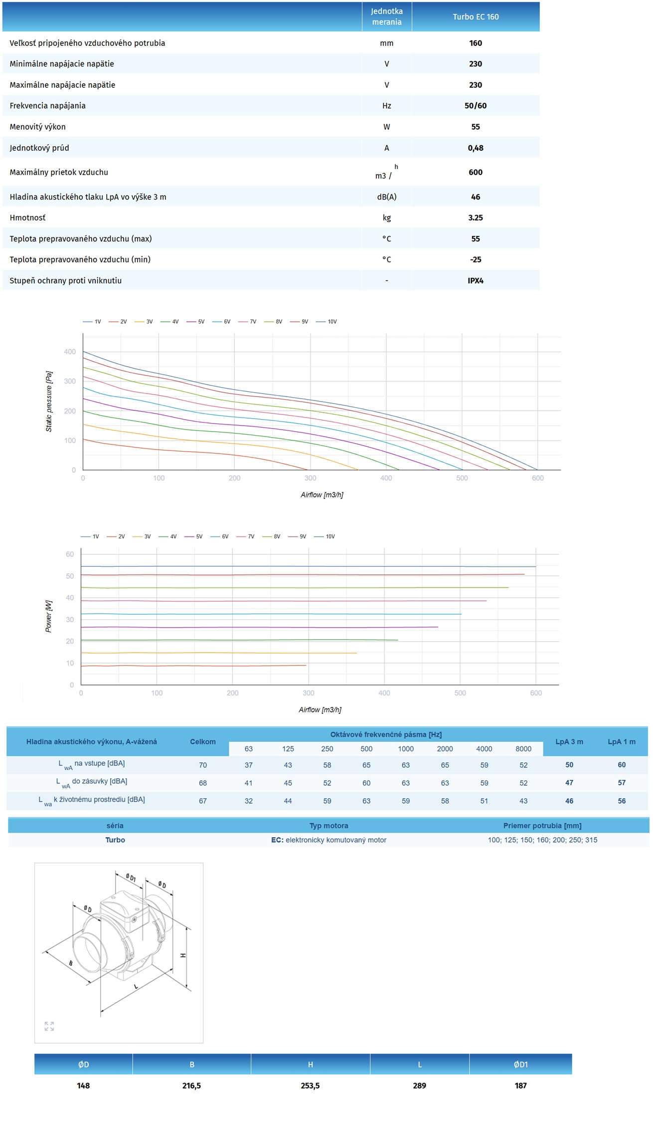 Poloradiálne potrubné ventilátory Blauberg Turbo 160 EC motor Ø 160mm-výkon:600m3/h napätie 230V EC: elektronicky komutovaný motor sú navrhnuté pre prívodné a odsávacie ventilačné systémy vyžadujúce vysokú energetickú účinnosť, vynikajúcu odozvu, vysoký tlak a prietok vzduchu pri udržiavaní hluku pod kontrolou – ako sú komerčné a priemyselné priestory s vysokou vlhkosťou (napr. kúpeľne a kuchyne), ako aj byty, vily, obchody a kaviarne. Kompatibilné so vzduchovými kanálmi s priemerom 160mm. Otáčky ventilátora sa ovládajú pomocou riadiaceho signálu 0–10 V z nasledujúcich zdrojov: integrovaný alebo externý regulátor otáčok ovládač so snímačmi centrálny BMS systém. Hodnota riadiaceho signálu sa mení v závislosti od teploty vzduchu, tlaku, koncentrácie dymu a ďalších parametrov. Pri zmene hodnoty signálu ventilátor s EC motorom zodpovedajúcim spôsobom mení rýchlosť otáčok a dodáva požadované množstvo vzduchu do ventilačného systému. Počítačové centrálne riadiace systémy budovy (BMS) umožňujú integráciu niekoľkých EC motorov do siete a presné individuálne riadenie prevádzky každého ventilátora. DIZAJN Turbo EC ventilátory kombinujú všestrannosť a vynikajúci výkon axiálnych aj odstredivých ventilátorov, ktoré vytvárajú silný prúd vzduchu a vysoký tlak pri zachovaní charakteristickej energetickej účinnosti a odozvy EC motorov. Plášť ventilátora Turbo EC je vyrobený z nízko horľavého polypropylénu. Odnímateľná centrálna jednotka s motorom, obežným kolesom a svorkovnicou je pripevnená k armatúram pomocou špeciálnych montážnych konzol s integrovanými západkami. Vďaka tomu je údržba ventilátora mimoriadne jednoduchá a pohodlná. Servis ventilátora už nevyžaduje veľké rozoberanie a demontáž ventilátora: všetko, čo musíte urobiť, je vybrať hlavnú jednotku z krytu a vykonať údržbu podľa potreby. Vstupná armatúra má profilovaný zberač, ktorý zaisťuje hladké prúdenie vzduchu do ventilátora. Kónicky tvarované obežné kolesá so špeciálne profilovanými lopatkami spôsobujú kruhový nárast rýchlosti, čo má za následok zvýšenie prietoku vzduchu a zvýšenie tlaku v porovnaní s konvenčnou konštrukciou. Kombinácia vývodu ventilátora, difúzora, špeciálne navrhnutého obežného kolesa a usmerňovača umožňuje optimálnu distribúciu vzduchu: vysoký vzduchový výkon a tlak bez nadmernej hlučnosti. MONTÁŽ Ventilátory sú určené na inštaláciu do vzduchovodov so zodpovedajúcim priemerom na akomkoľvek mieste ventilačného systému bez obmedzenia montážneho uhla. Kryt ventilátora má plochú montážnu dosku pre bezpečnú montáž na stenu. Elektrické pripojenie a inštalácia musí byť vykonaná v súlade s návodom na použitie a schémou elektrického zapojenia aplikovanou na svorkovnicu. Jeden systém môže mať niekoľko ventilátorov inštalovaných paralelne na zvýšenie výstupnej kapacity alebo v sérii na zvýšenie pracovného tlaku. MOTOR Vysokoúčinný jednosmerný EC motor. EC technológia spĺňa aktuálne požiadavky na energeticky úsporné a regulovateľné vetranie a poskytuje až 35 % úsporu energie v porovnaní s asynchrónnymi motormi. EC motor zaisťuje plne regulovateľný rozsah otáčok ventilátora a má integrovanú ochranu proti prehriatiu s automatickým reštartom. EC motor nemá žiadne trecie a opotrebované časti ako kondenzátor a kefy. Namiesto toho sa používa bezúdržbová doska elektronických obvodov EC regulátora. Obežné koleso je dynamicky vyvážené. Ventilátor je kompatibilný s 50 Hz a 60 Hz sieťou a maximálna rýchlosť nezávisí od frekvencie siete.
