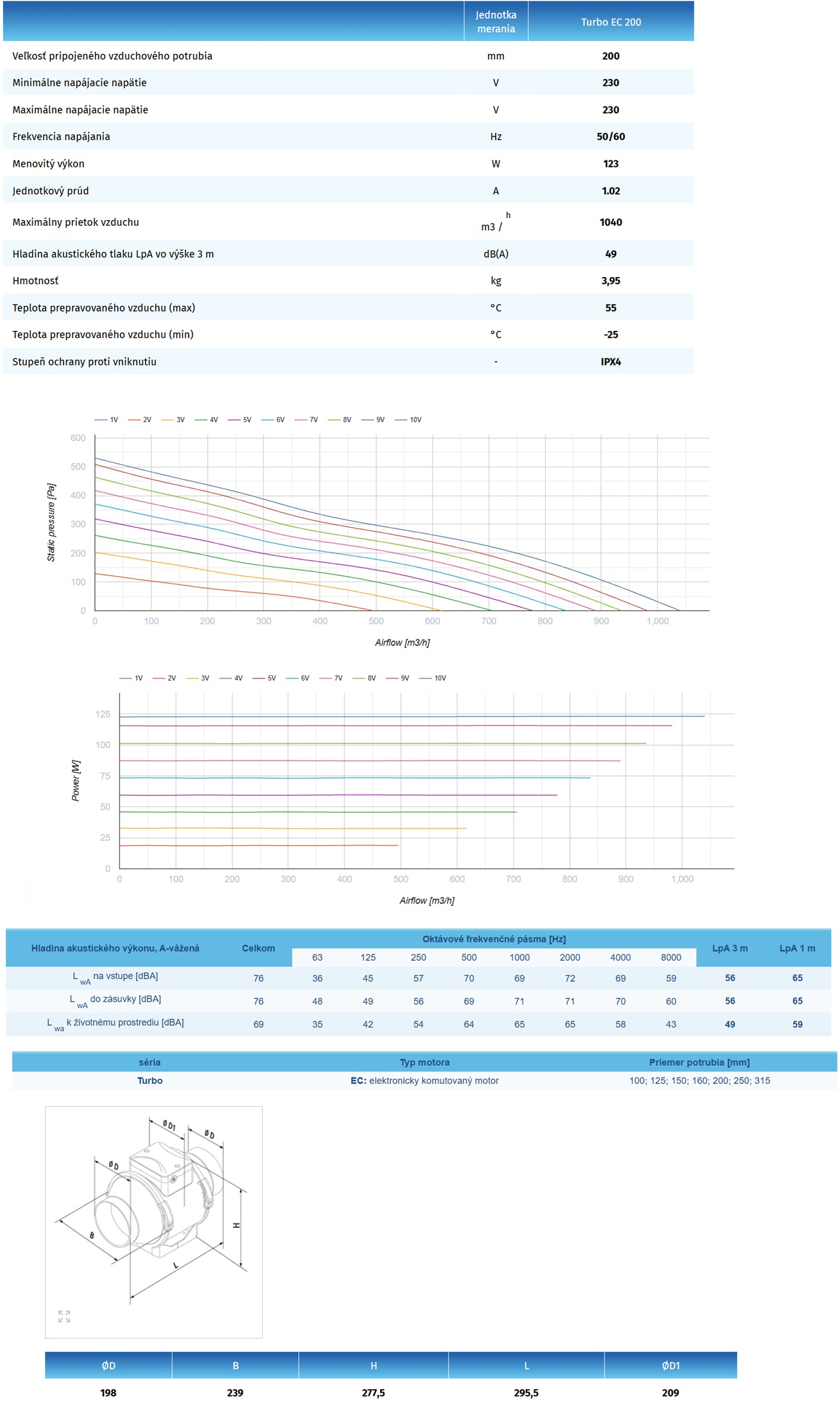 Poloradiálne potrubné ventilátory Blauberg Turbo 200 EC motor Ø 200mm-výkon:1040m3/h napätie 230V