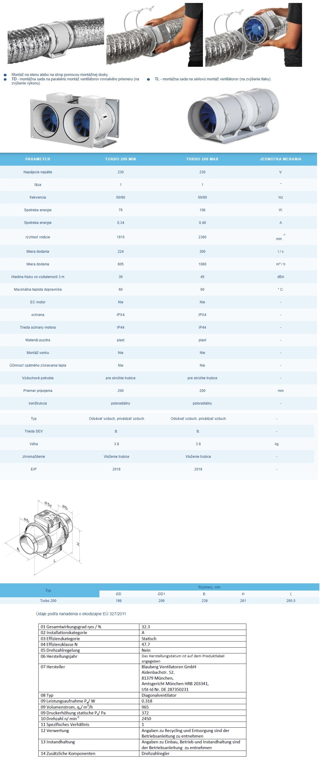 Poloradiálne potrubné ventilátory Blauberg Turbo 200 priemer 200mm-dvojrýchlostný výkon:805-1080m3/h napätie 230V sú určené pre