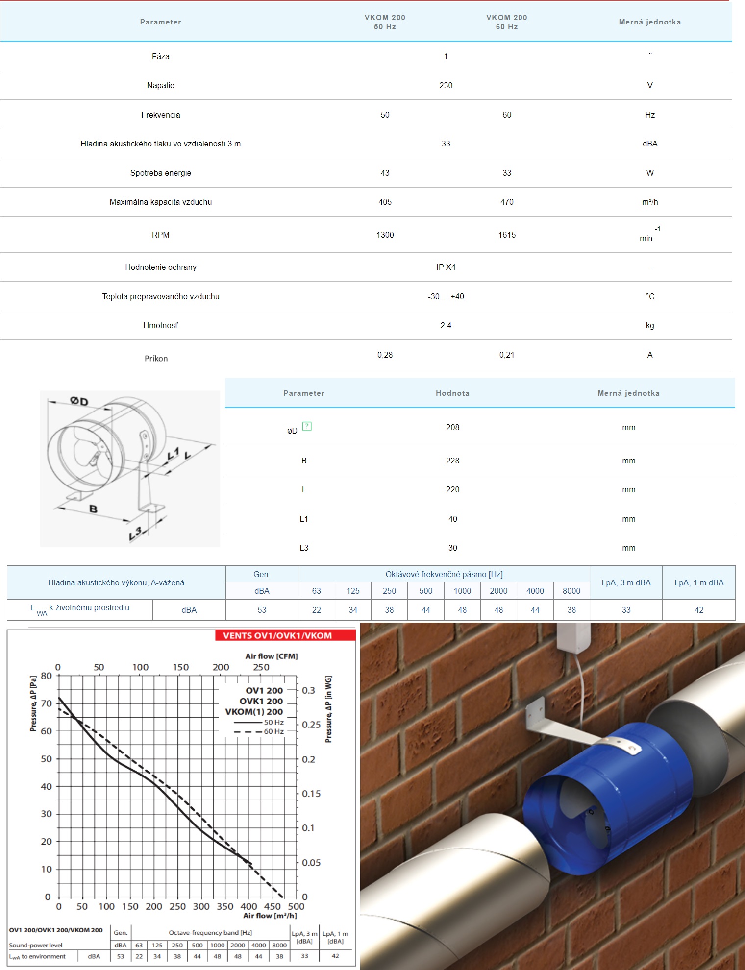 Potrubný ventilátor maximálny výkon 405m3/h 230V je určený pre ventilačné systémy na rôzne priestory, kde je požadovaná vysoká vzdušná kapacita pri relatívne nízkom systémovom odpore.Skriňa potrubného ventilátora VENTS VKOM je vyrobená z oceľového plechu potiahnuté polymérovou vrstvou a obežné koleso je vyrobené z hliníka. Svorkovnica potrubného ventilátora je vybavená káblom pre vzdialené pripojenie.Motor potrubného ventilátora: Jednofázový asynchrónny motor je vybavený tepelnou ochranou proti prehriatiu s automatickým reštartom, rovnako ako s gulôčkovými ložiskami