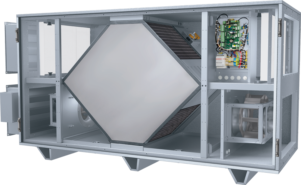 Vysokoúčinný protiprúdový výmenník tepla vyrobený z profilovaných hliníkových platní, plnený elastickým tepelne odolným tmelom. Odtoková vaňa z nehrdzavejúcej ocele na prívodnej aj výfukovej strane.