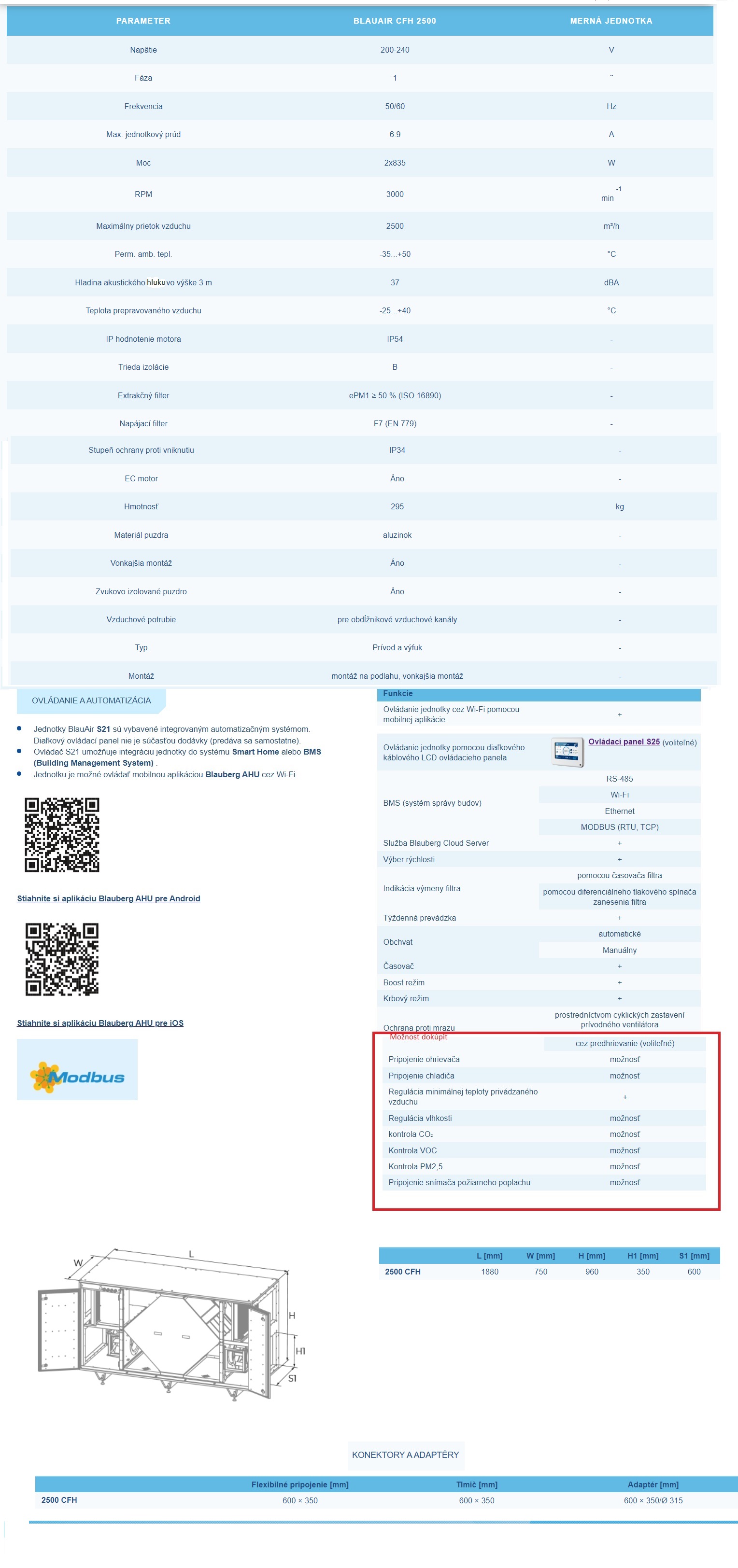 Priemyselný rekuperátor na podhladu BlauAir BL 02 CFH 2500HWCW S25 2500m3/h+vodný ohrievač+vodný chladič s riadiacou jednotkou S 25 Vysokoúčinné EC ventilátory, dozadu zakrivený, vonkajší rotor. Integrované ovládacie prvky typu plug-and-play.