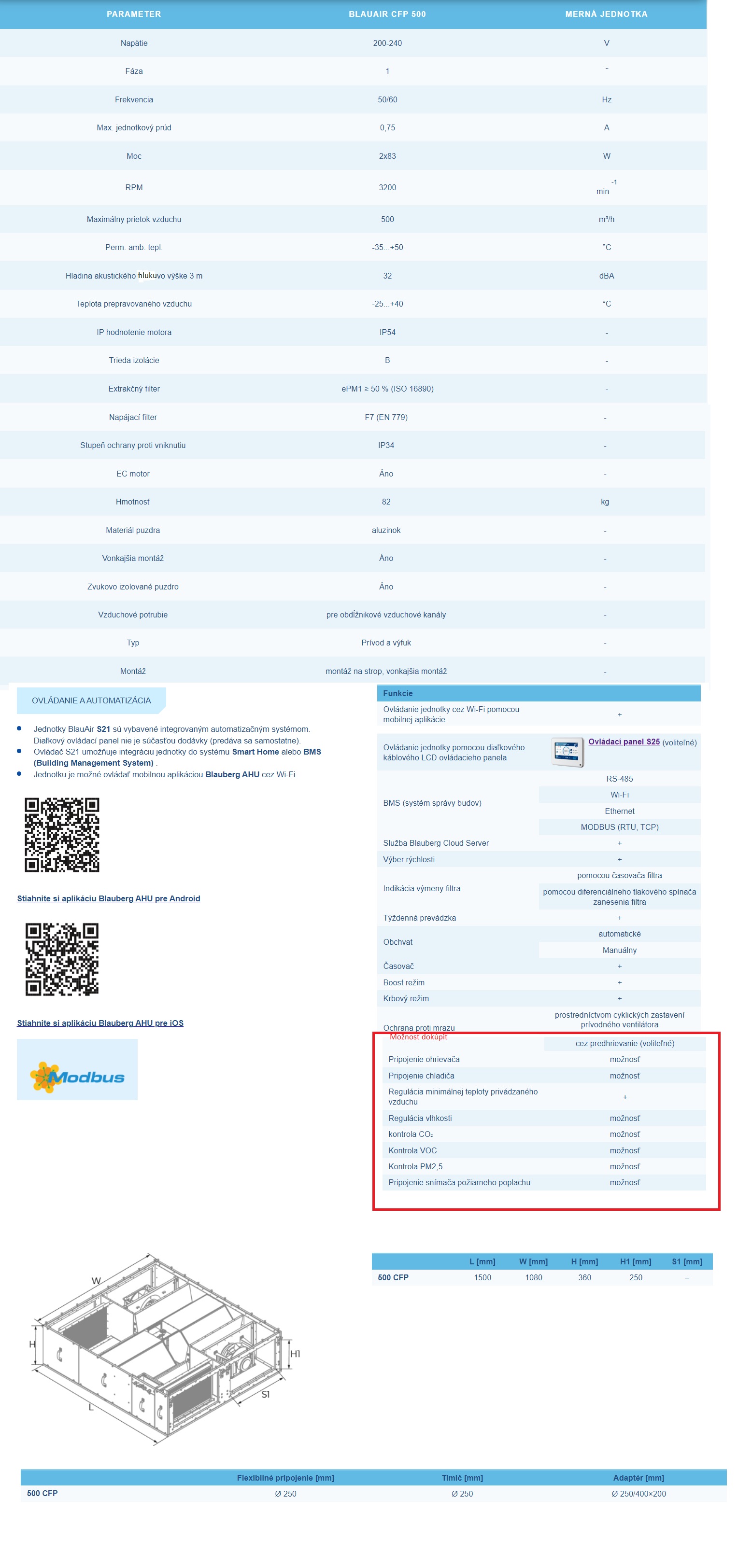 Webové rozhranie, MODBUS, obsahuje výstupy predoobjednateľné  DX alebo Hydronic chladenie/kúrenie.