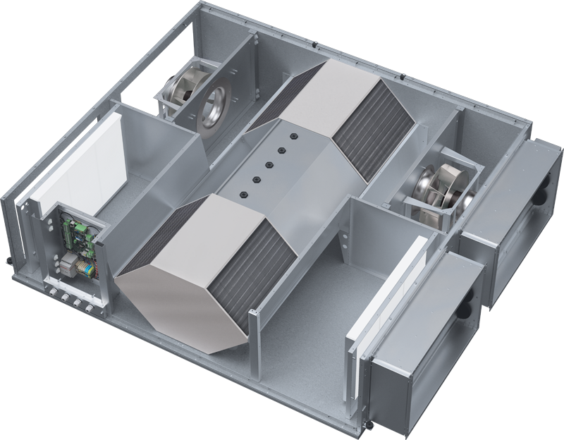 Vysokoúčinný protiprúdový výmenník tepla vyrobený z profilovaných hliníkových platní, plnený elastickým tepelne odolným tmelom. Odtoková vaňa z nehrdzavejúcej ocele na prívodnej aj výfukovej strane.