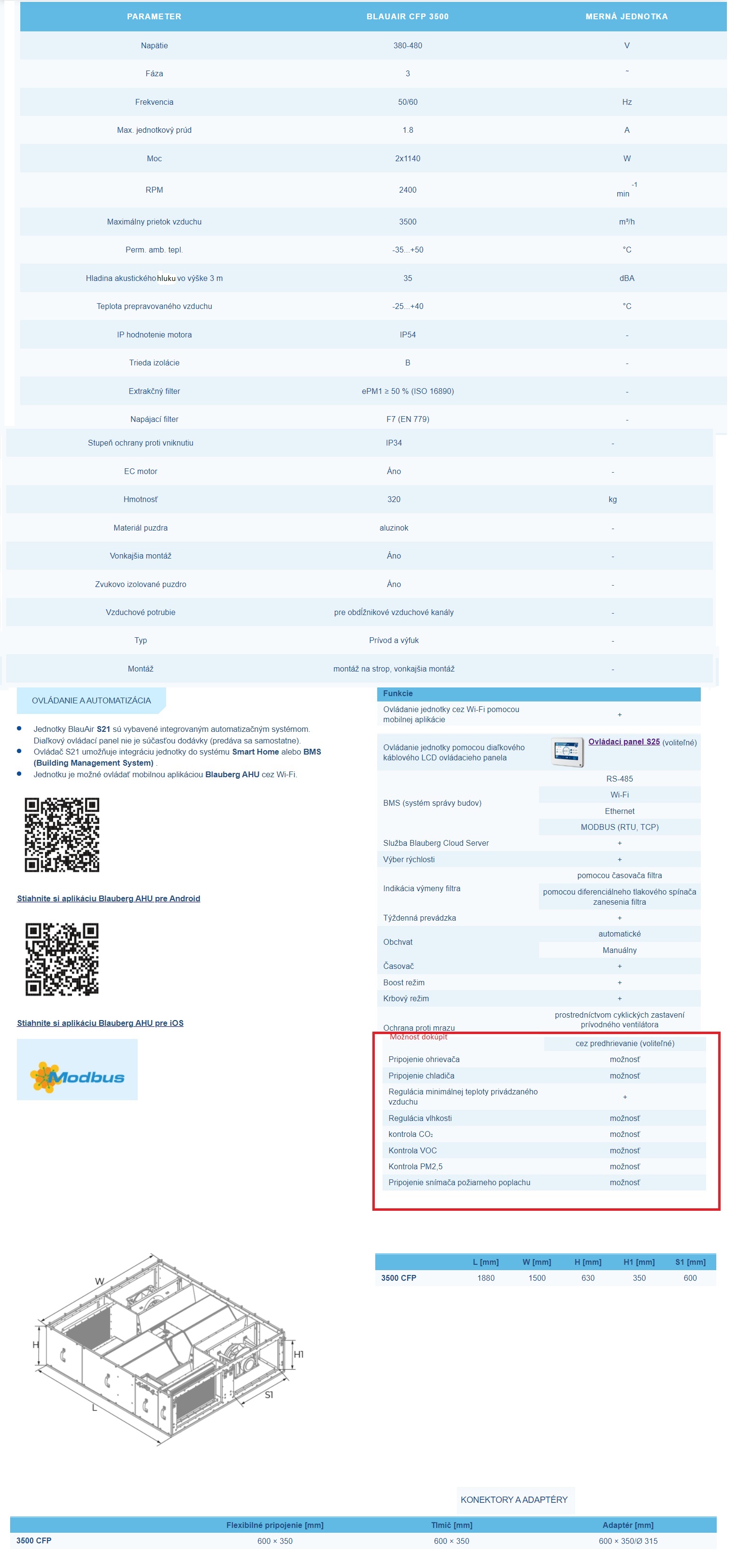Priemyselný rekuperátor podstropný BlauAir BL 03 CFP 3500HW S25  3500m3/h+vodný ohrievač s riadiacou jednotkou S 25 obsahuje vysokoúčinné EC ventilátory s dozadu zakriveným  vonkajšími lopatkami. Integrované ovládacie prvky typu plug-and-play.