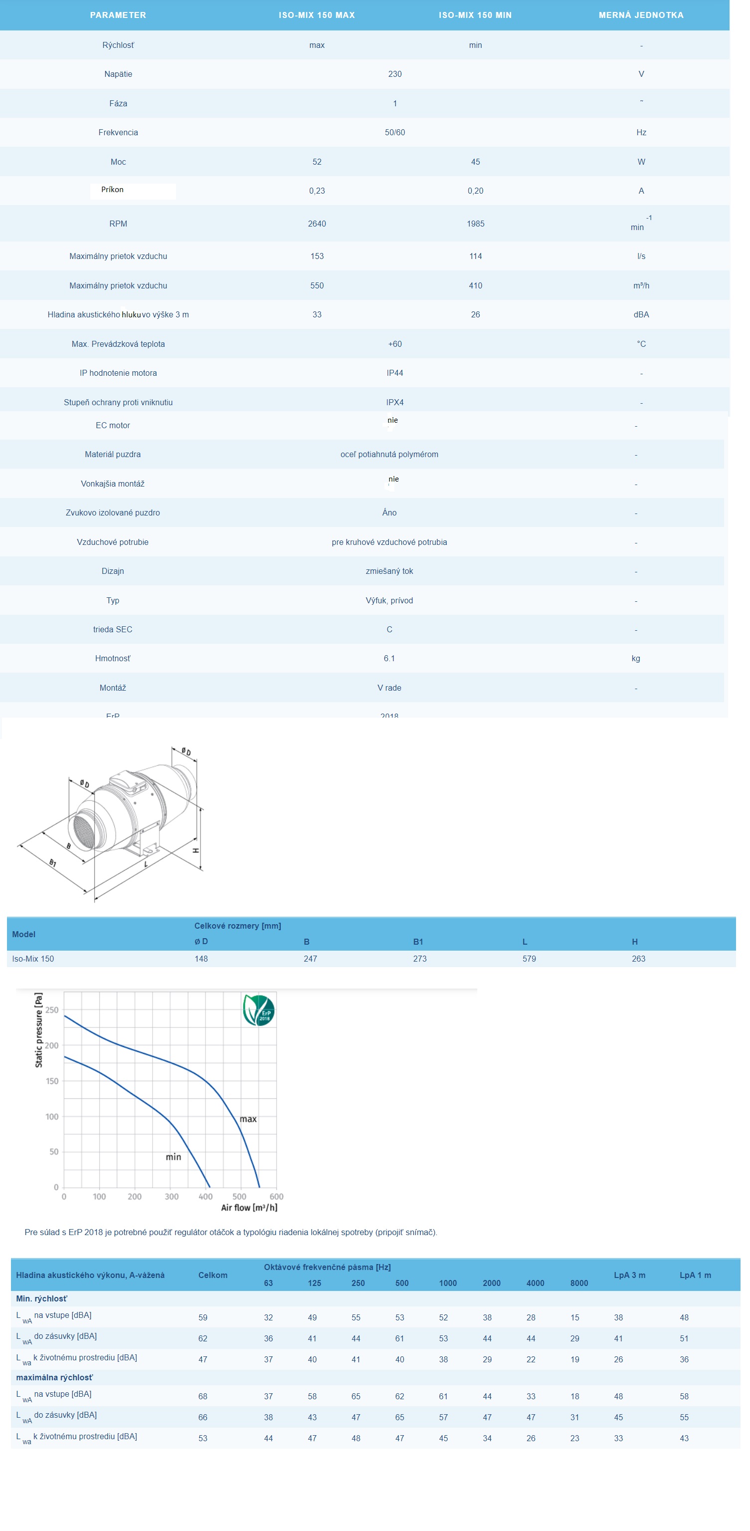 Priemyselný ventilátor Blauberg Iso-Mix 150 výkon Ø 150mm-410 a 550m3/h dvojrýchlostný napätie 230V.Priemyselné ventilátory  pre systémy prívodu a odvodu vetrania inštalované v rôznych priestoroch s vysokými požiadavkami na hladinu hluku.Priemyselný ventilátor pre vetracie vzduchové kanály vyžadujúce vysoký tlak, silný prietok vzduchu a nízku hladinu hluku.Priemyselný ventilátor je  kompatibilný so vzduchovými kanálmi Ø 150 mm.