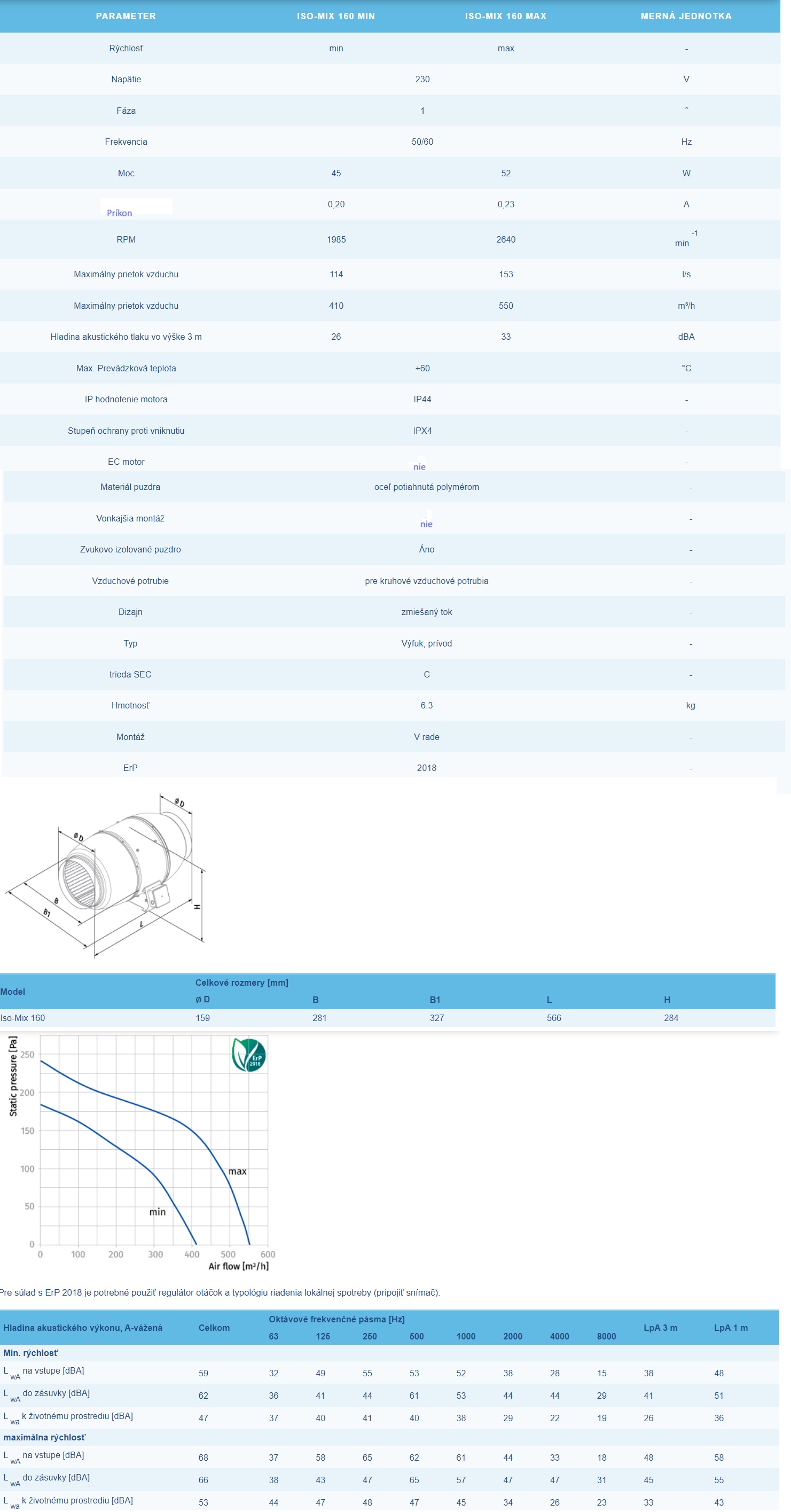 Priemyselný ventilátor Blauberg Iso-Mix 160 výkon Ø 160mm-410 a 550m3/h dvojrýchlostný napätie 230V.Priemyselné ventilátory pre systémy prívodu a odvodu vetrania inštalované v rôznych priestoroch s vysokými požiadavkami na hladinu hluku.Priemyselný ventilátor pre vetracie vzduchové kanály vyžadujúce vysoký tlak, silný prietok vzduchu a nízku hladinu hluku.Priemyselný ventilátor je kompatibilný so vzduchovými kanálmi Ø 160 mm.