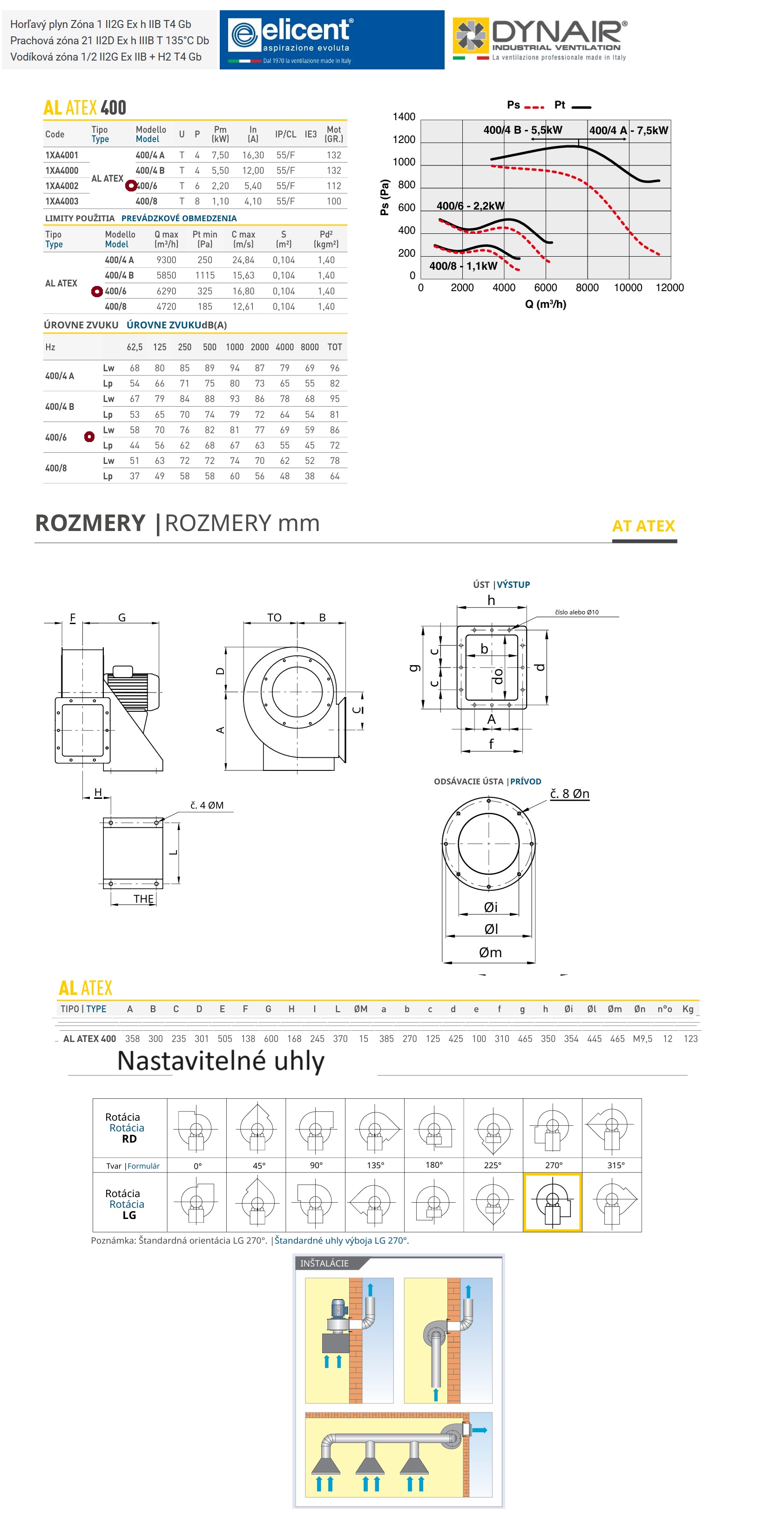 Radiálne ventilátory ELICENT DYNAIR AT ATEX 400 /4BT-400V II2G IIB T4 /ochrana motora Ex Db/ výkon 6290m3/h 6-pólový 400V sú