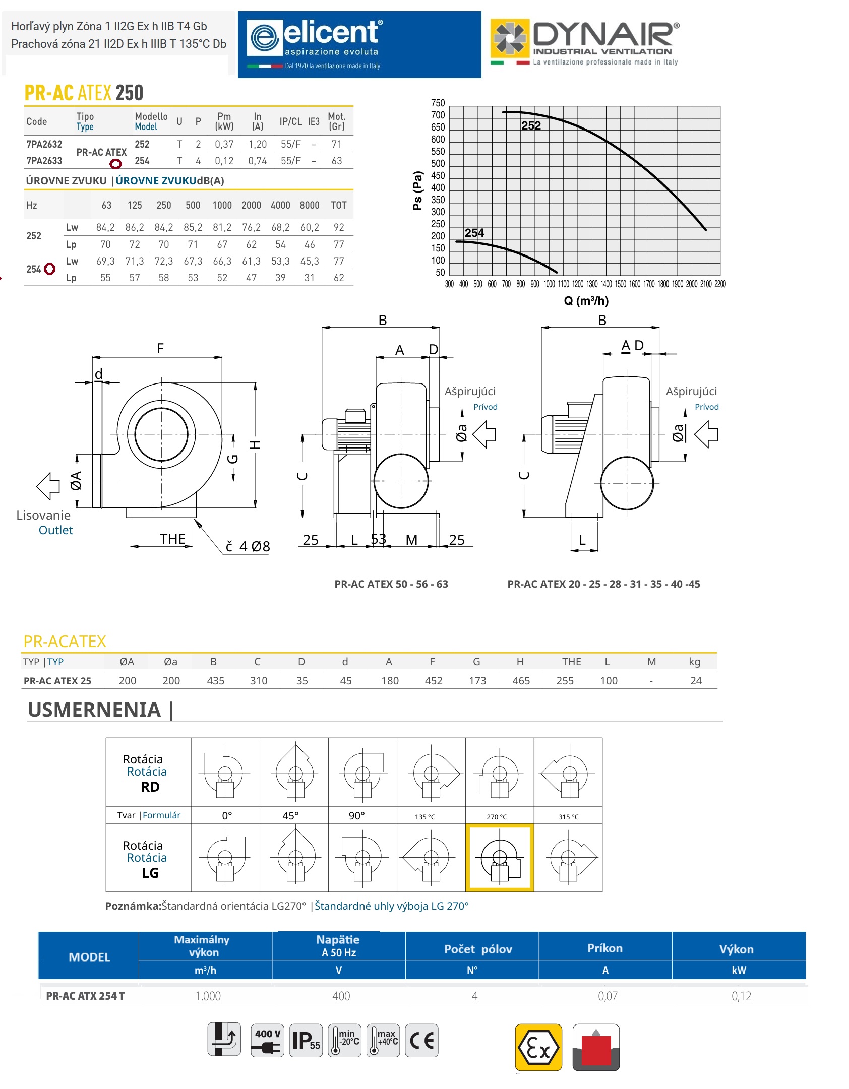 Radiálny ventilátor do výbušného prostredia Elicent DYNAIR PR-AC ATEX 254/4T-400V II3G IIB T4 /ochrana motora Ex Db/ výkon: 1000m3/h 4-pólový 400V.Séria PR-AC ATEX je vhodná na prepravu