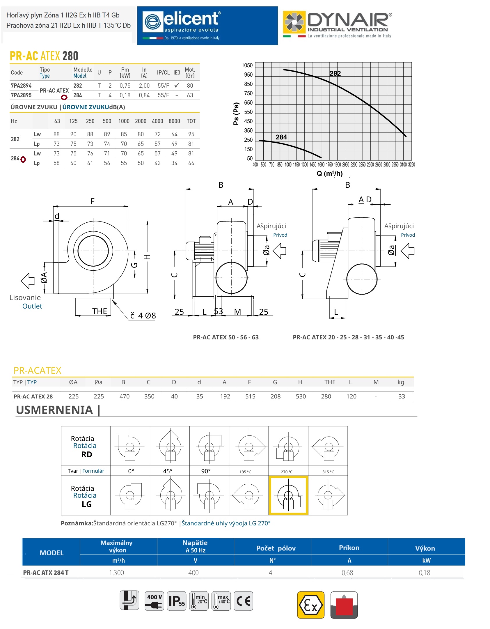Radiálny ventilátor do výbušného prostredia Elicent DYNAIR PR-AC ATEX 284/4T-400V II3G IIB T4 /ochrana motora Ex Db// výkon: 1300m3/h 4-pólový 400V.Séria PR-AC ATEX je vhodná na prepravu