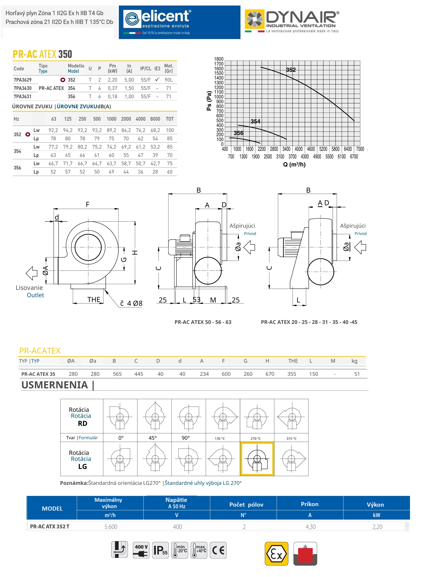 Radiálny ventilátor do výbušného prostredia Elicent DYNAIR PR-AC ATEX 352/2T-400V II3G IIB T4 /ochrana motora Ex Db/ výkon: 5600m3/h2-pólový 400V.Séria PR-AC ATEX je vhodná na prepravu
