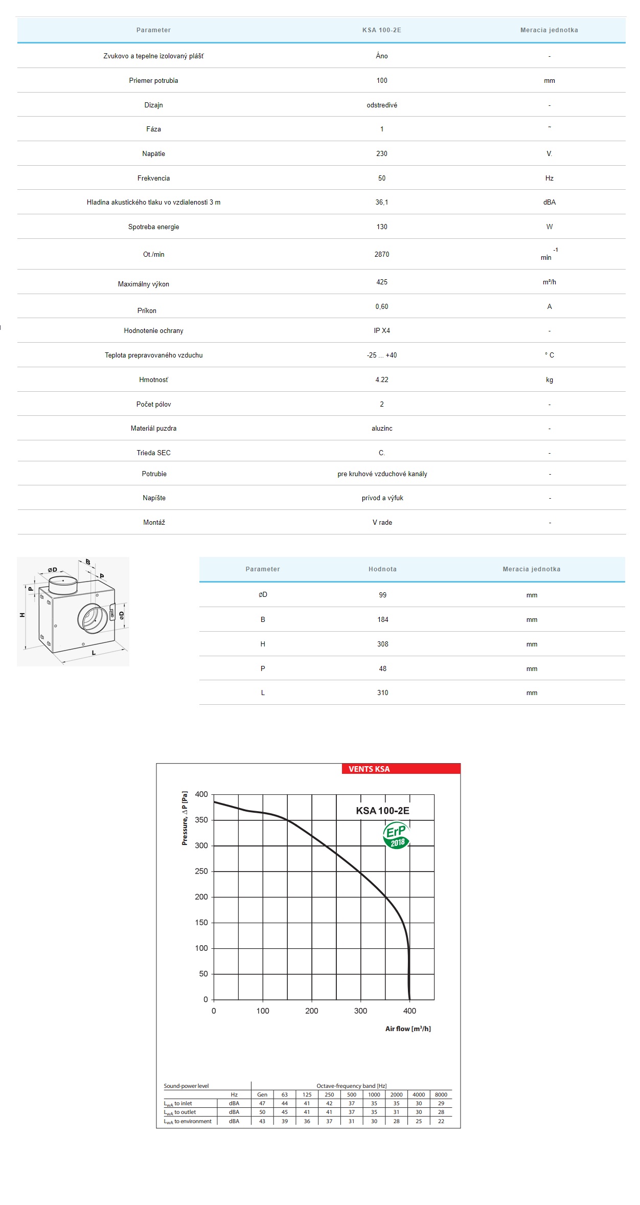 Radiálne ventilátory VENTS KSA Ø100-2Emm výkon 425m3/h.Radiálne ventilátory nízkohlukové na umiestnemie do podhľadov a iných málo prístupných priestorov,Kryt ventilátora je vyrobený z Aluzinkového plechu. Tepelne a zvukovo izolačná vrstva je vyrobená z penového polystyrénu.Obežné koleso je vyrobené z pozinkovanej ocele a dopredu zahnutými lopatkami ,je poháňaný pomocou 2 pólovým asynchrónnym motorom s vonkajším rotorom. Motor je vybavený guličkovými ložiskami pre dlhšiu životnosť. Pre presnú funkčnosť a bezpečnú prevádzku je každé obežné koleso je dynamicky vyvážené. Motor krytie IP 44.