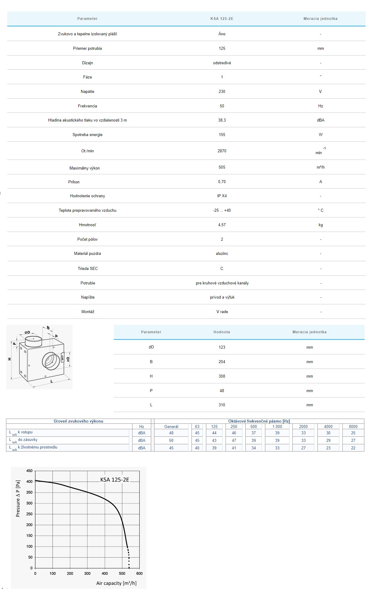 Radiálne ventilátory VENTS KSA Ø125mm výkon 505m3/h.Radiálne ventilátory nízkohlukové na umiestnemie do podhľadov a iných málo prístupných priestorov,Kryt ventilátora je vyrobený z Aluzinkového plechu. Tepelne a zvukovo izolačná vrstva je vyrobená z penového polystyrénu.Obežné koleso je vyrobené z pozinkovanej ocele a dopredu zahnutými lopatkami ,je poháňaný pomocou 2 pólovým asynchrónnym motorom s vonkajším rotorom. Motor je vybavený guličkovými ložiskami pre dlhšiu životnosť. Pre presnú funkčnosť a bezpečnú prevádzku  je každé obežné koleso je dynamicky vyvážené. Motor krytie IP 44.