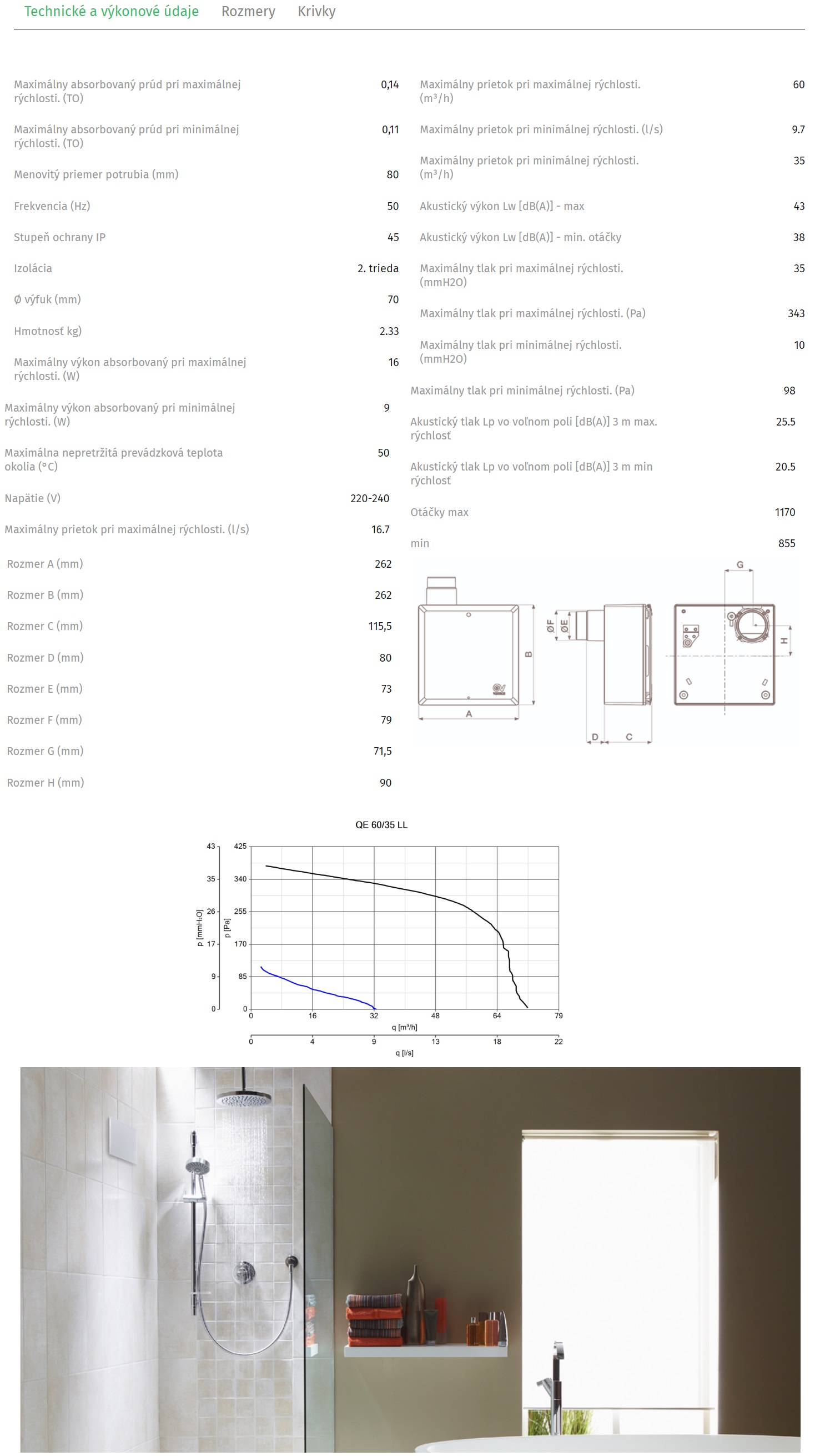 Radiálny ventilátor Vortice QE 60/35 LL – Qv=35/60m3/h, Ps=98/343Pa.Predný panel a závitovka zo samozhášavého bieleho ABS plastu (trieda V0).