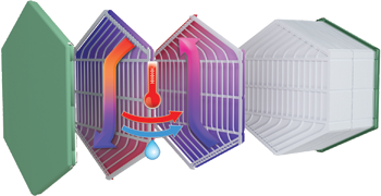 - V teplom období sa teplo a vlhkosť vonkajšieho vzduchu prenášajú do prúdu odpadového vzduchu cez entalpický výmenník tepla.